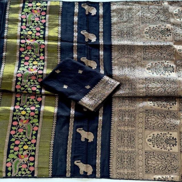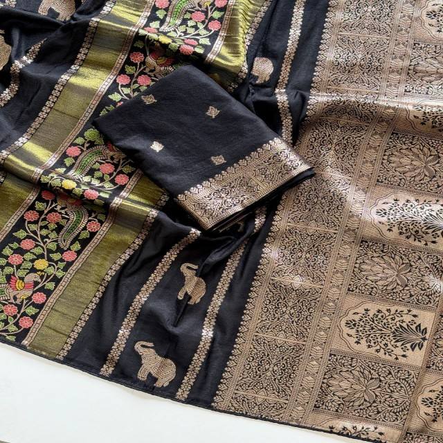 Sari VASTRA COTTAGE en viscose de Chine, tissé jacquard avec des broderies dorées Zari, motif Meenakari Paon et Éléphant Butta