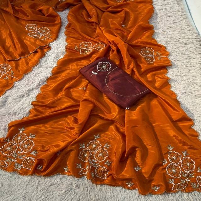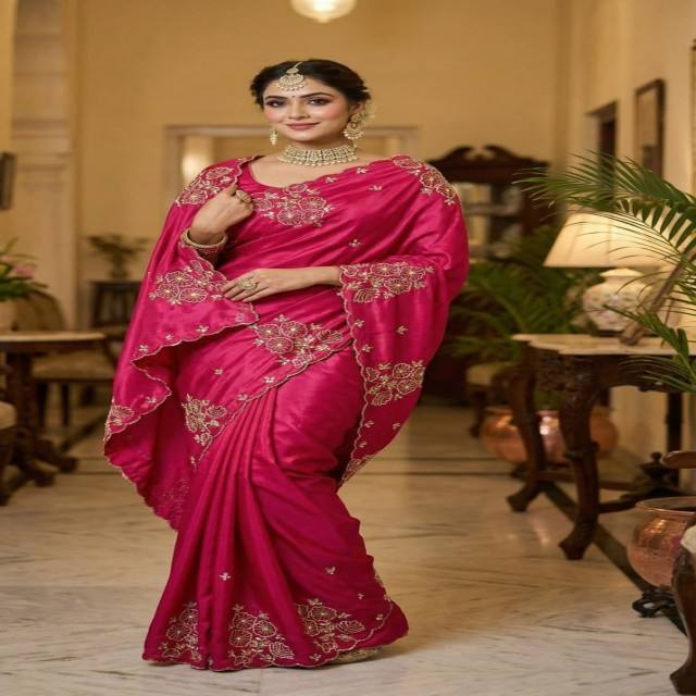 Sari en soie douce et brillante VASTRA COTTAGE, design de créateur, avec broderie Zarkan et travail de diamants, bordure ajourée, accompagné d'un chemisier élégant