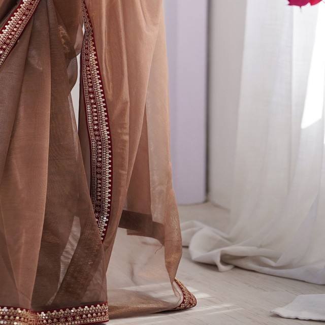 Sari de fête VASTRA COTTAGE avec blouse en velours brodée, couleur marron, tenue ethnique traditionnelle pour femmes