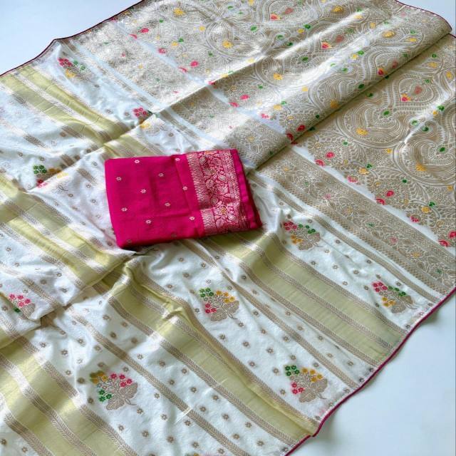 Sari en viscose de soie VASTRA COTTAGE Pure Chinya avec tissage Zari doré, motif floral Minakari Butta, teint à la main, et blouse contrastante