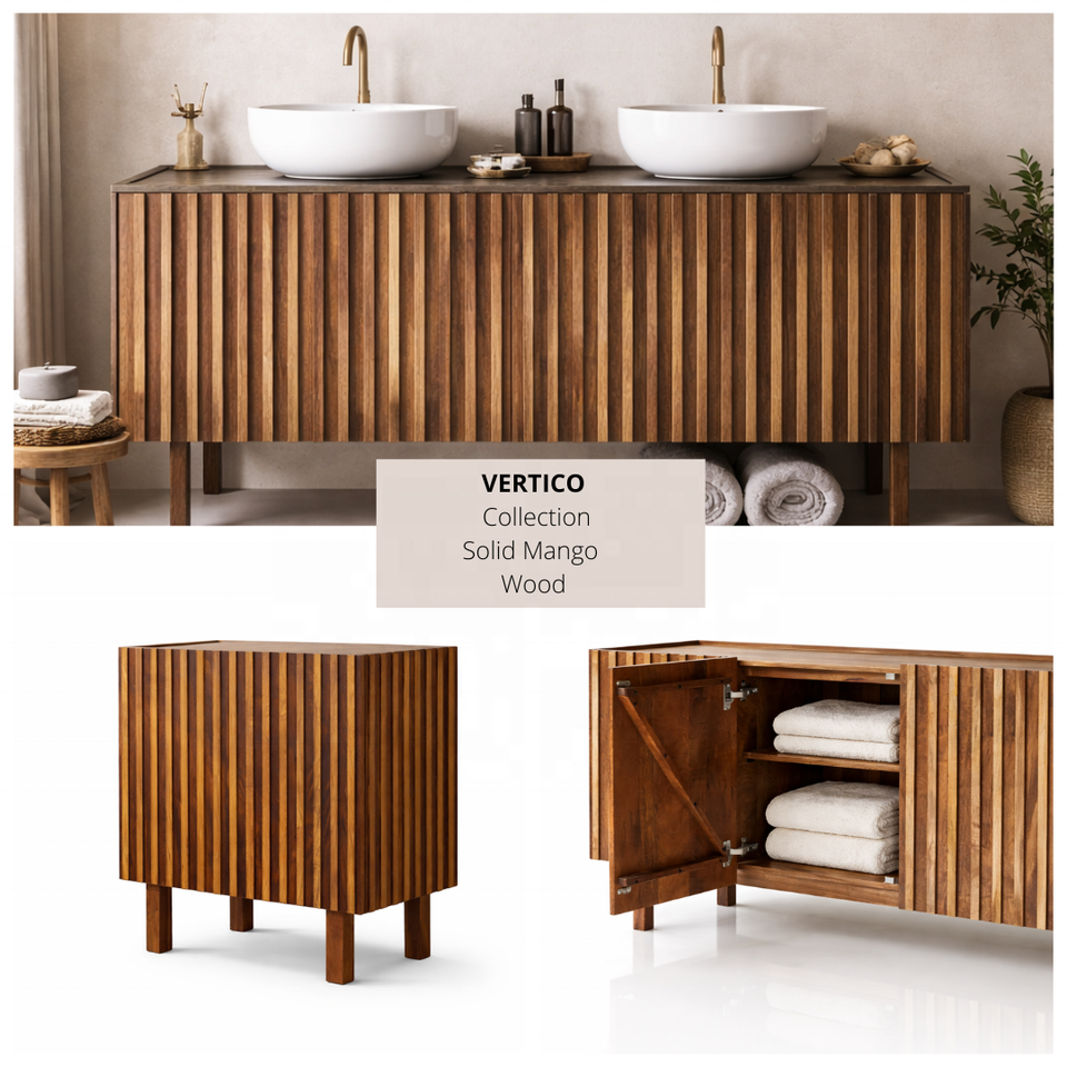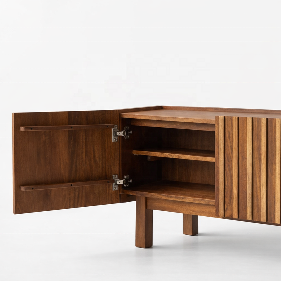 Meuble TV VERTICO en bois de manguier massif à nervures | Meuble de rangement pour salon avec 2 étagères et 2 compartiments | Hôtel Moderne
