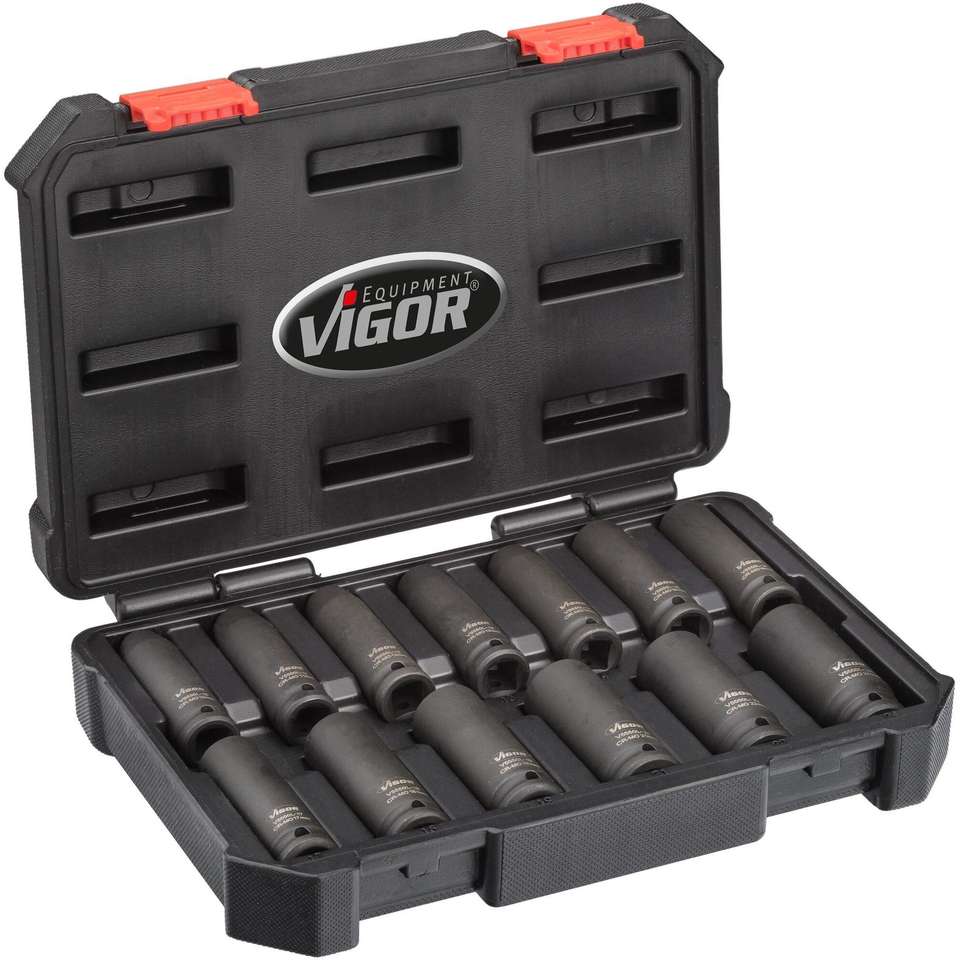 VIGOR Jeu de douilles à chocs ∙ long ∙ V5550L ∙ 1/2 pouce (12.5mm) carré, creux ∙ Profil à six pans extérieurs ∙ 13 pièces ∙ 10-24 ∙ Nu