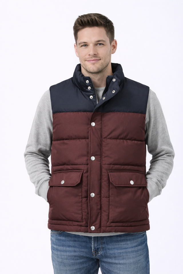 Veste matelassée bicolore bleu marine et bordeaux pour homme – Gilet d'hiver sans manches isolé avec boutons-pression, décontracté, pour l'extérieur