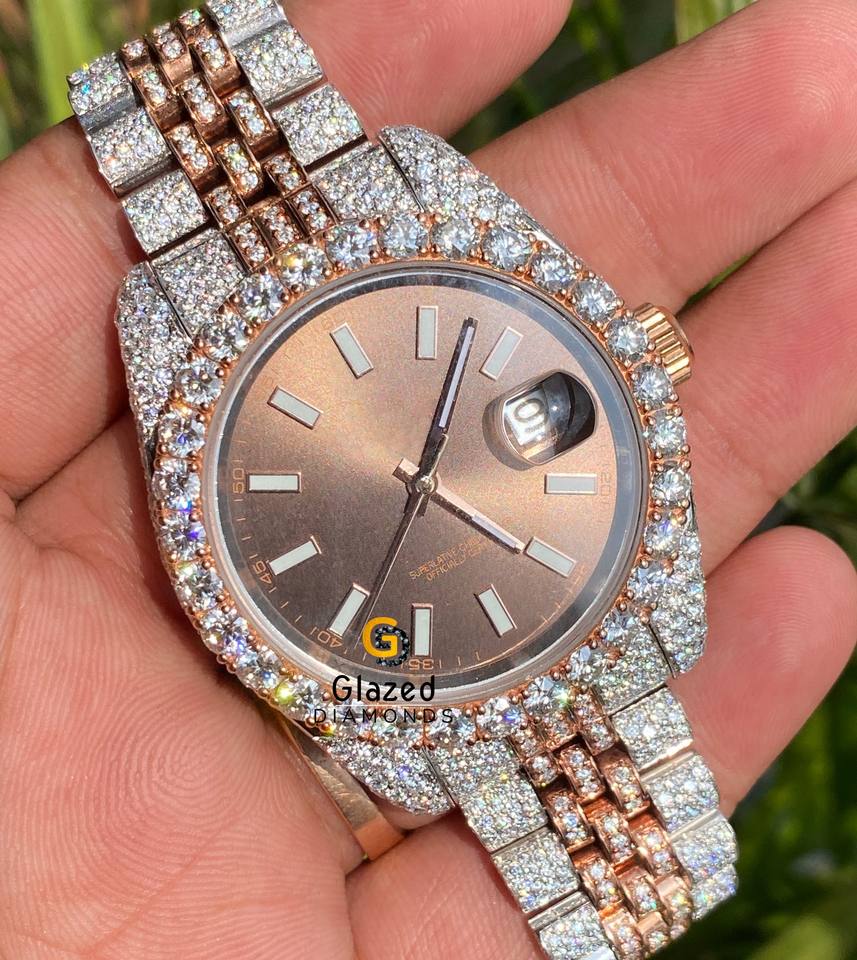 VVS Clarity Iced Out Luxury Hip Hop Stainless Steel DEF Color Cut Moissanite Watch Glass Dial Window Date and Brown Dial