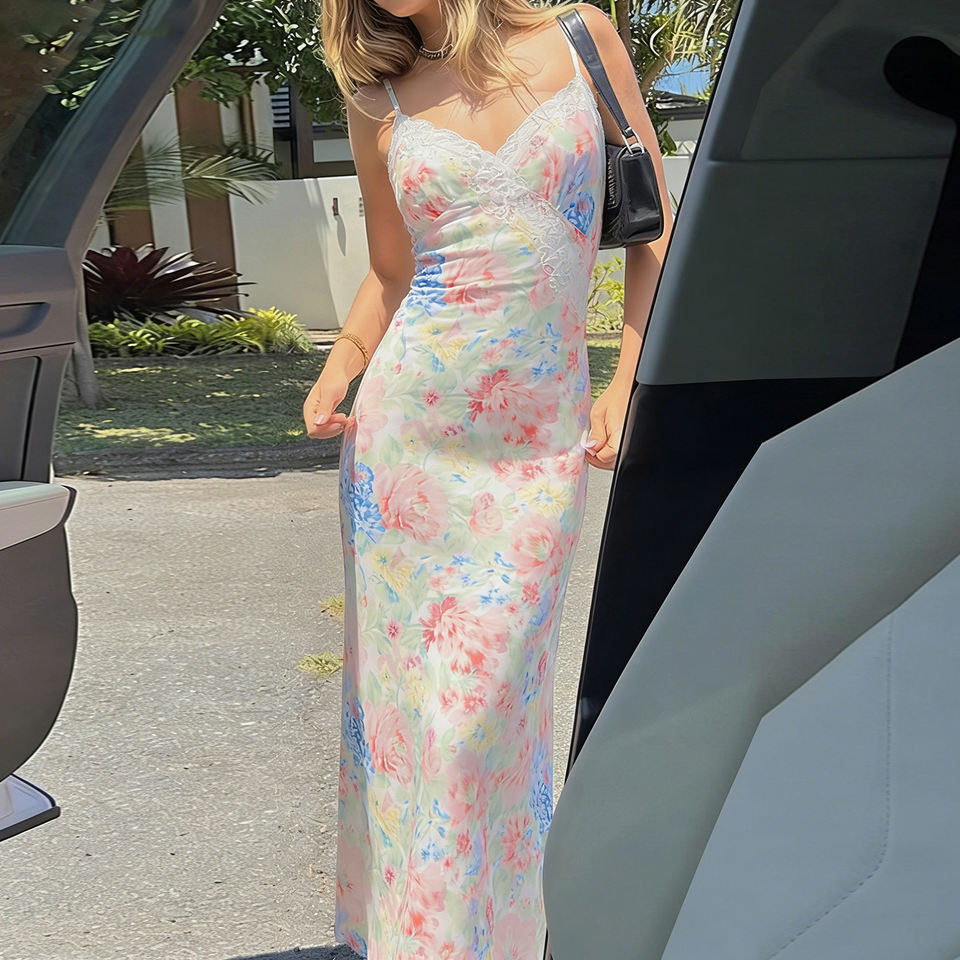 Robe longue maxi de plage à col en V, style vacances, imprimé floral Morandi, patchwork de dentelle, pour les vacances d'été
