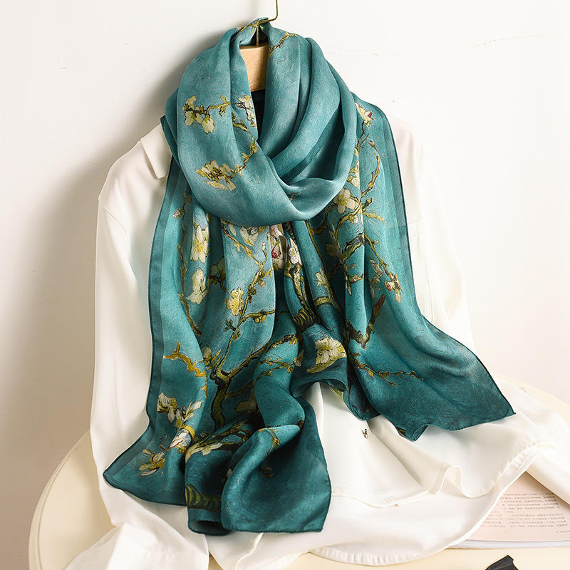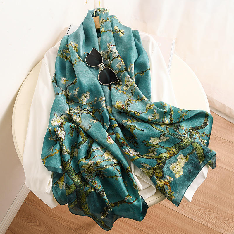 Foulard en satin de soie à fleurs d'abricot inspiré de Van Gogh, châle long à double usage avec imprimé de style sergé d'été pour le printemps et l'automne