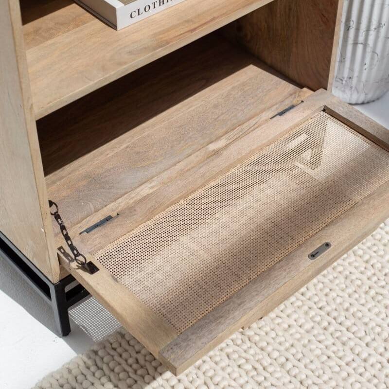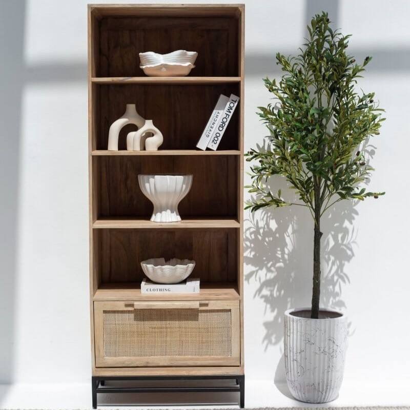 Étagères bibliothèque Vandana Altis Grand en rotin et bois de manguier avec base noire – Design de rangement moderne