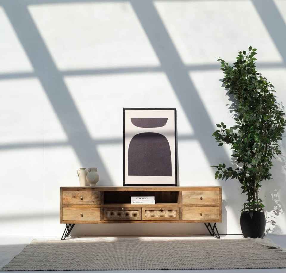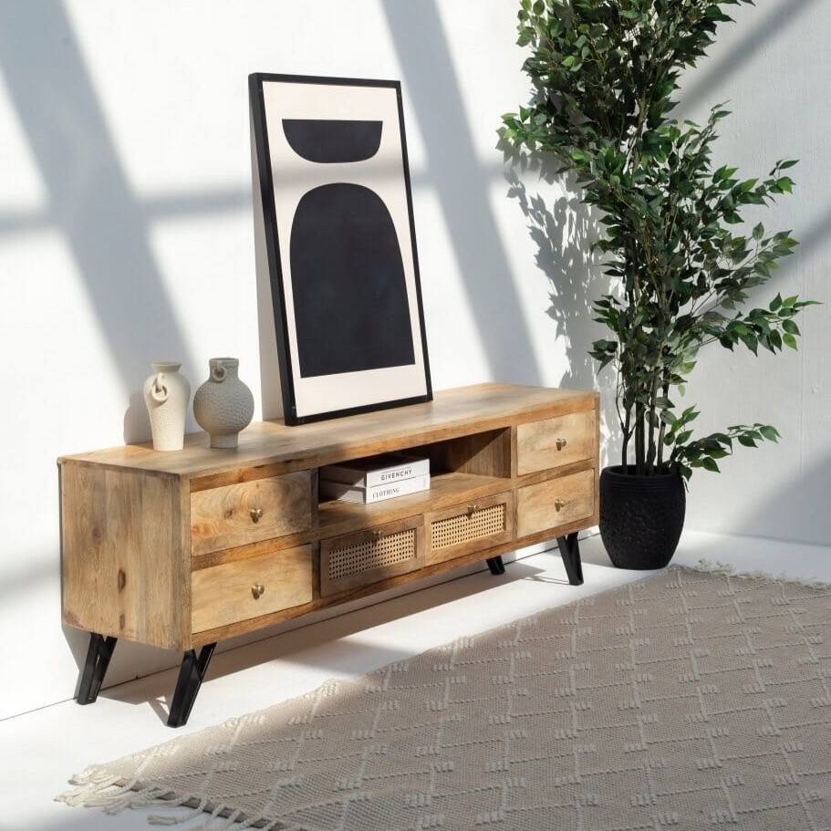 Meuble TV en rotin à six tiroirs Vandana Lunaris Prime, console de divertissement moderne en rotin naturel tressé
