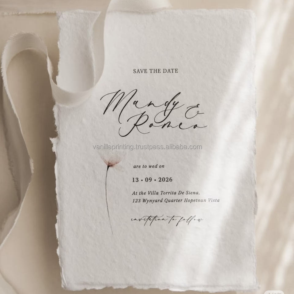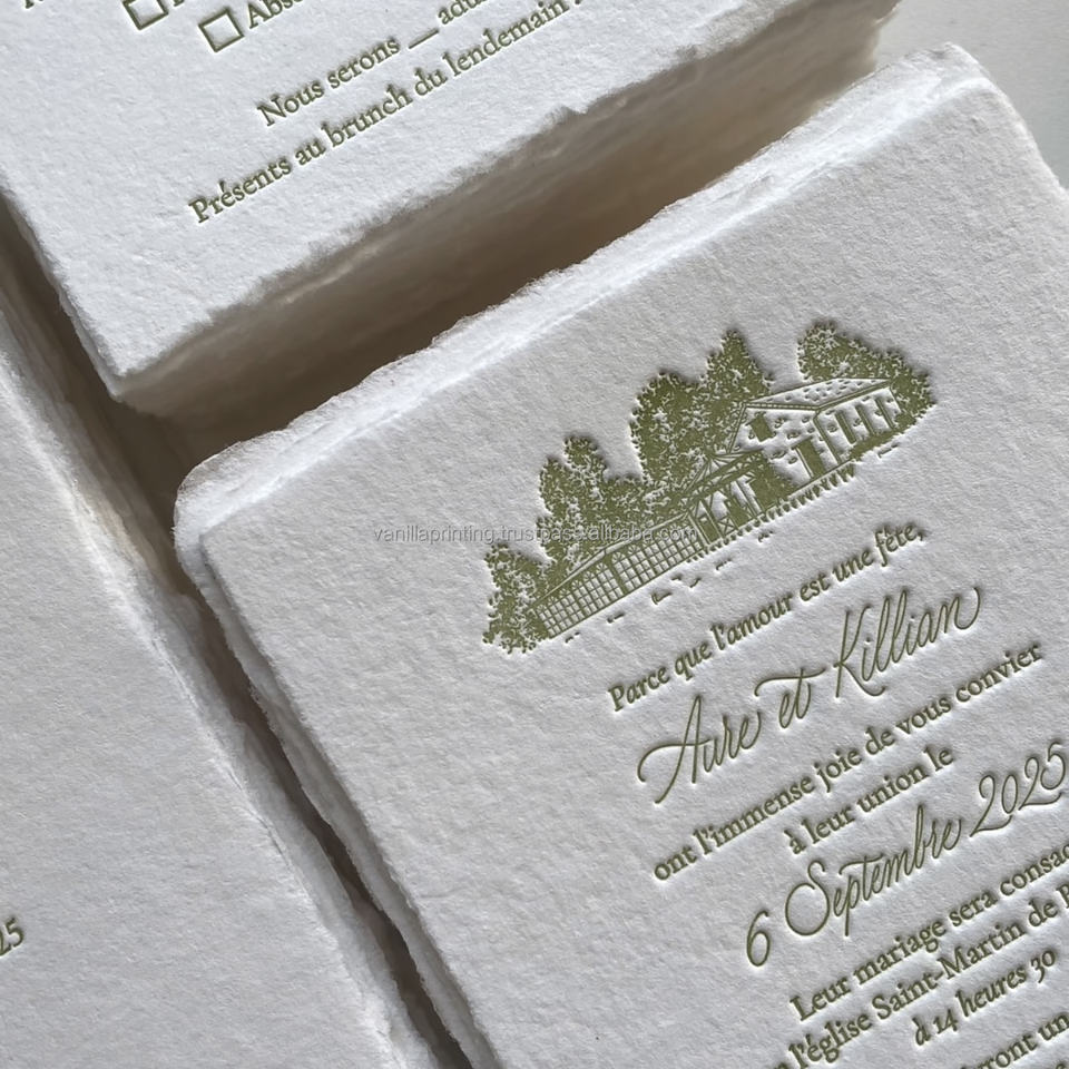 Ensemble d'invitations de mariage faites à la main avec bords festonnés, impression vanille, logo personnalisé, papier pur coton élégant et luxueux