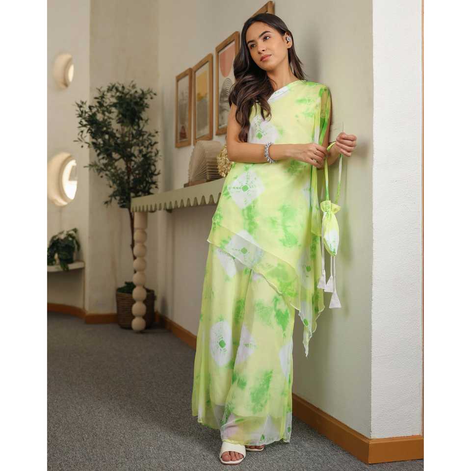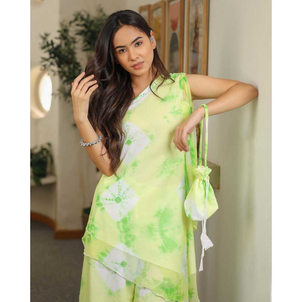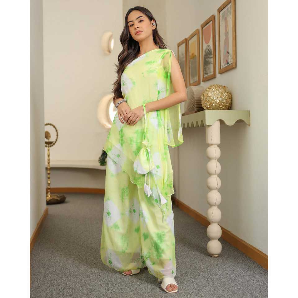 Ensemble Kurta Bohème Vannes à une épaule respirant en vert, taille XS, en tissu mousseline, Printemps/Été