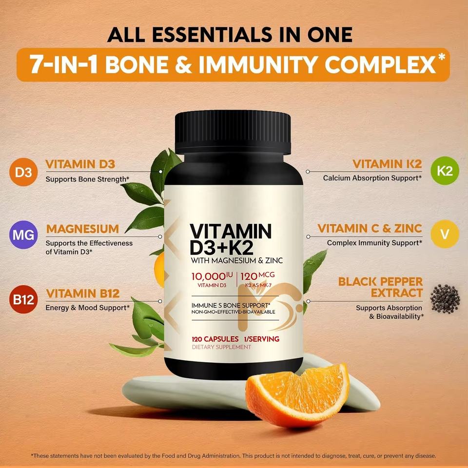 Vitamine C, Vitamine D3, Vitamine K2, Vitamine B12, Magnésium, Zinc, Extrait de poivre noir.Ingrédient principal