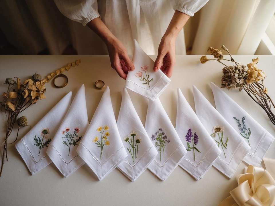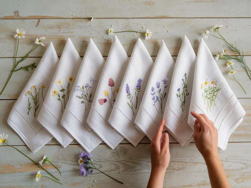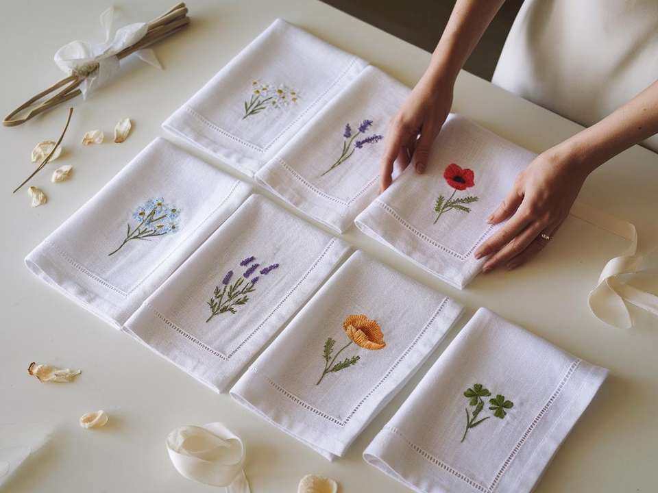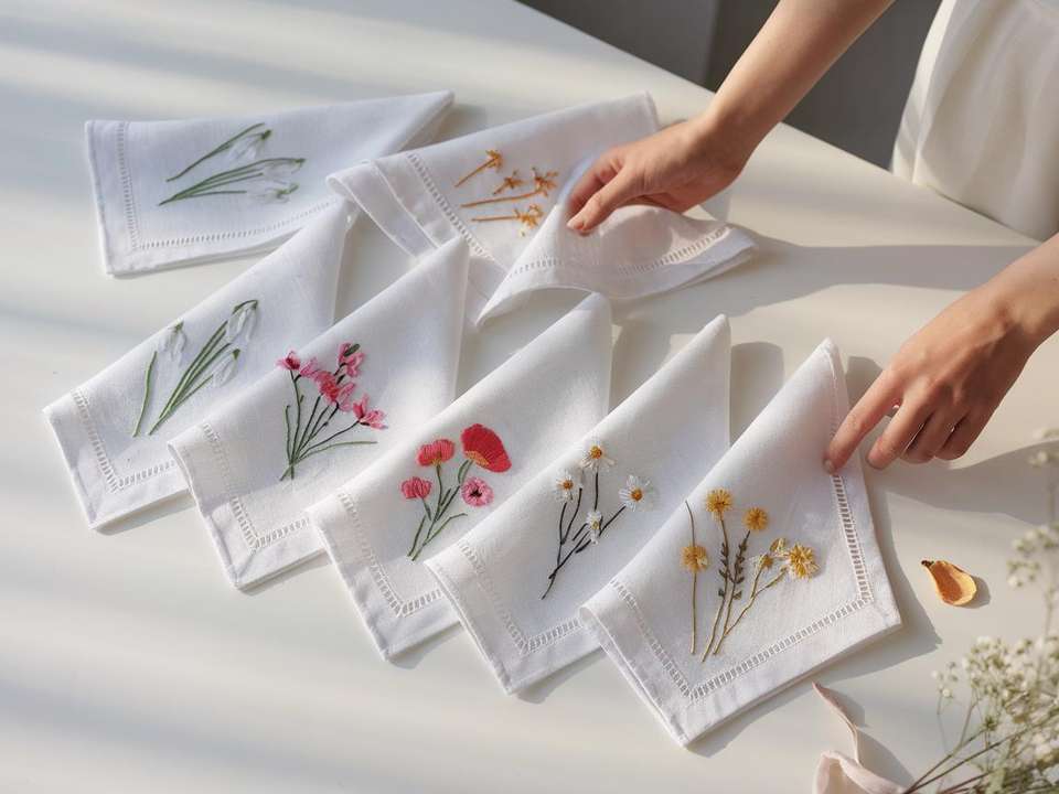 Divers mouchoirs en lin fleuri adaptés aux mariages, aux familles et aux restaurants, durables et fabriqués en 100% lin