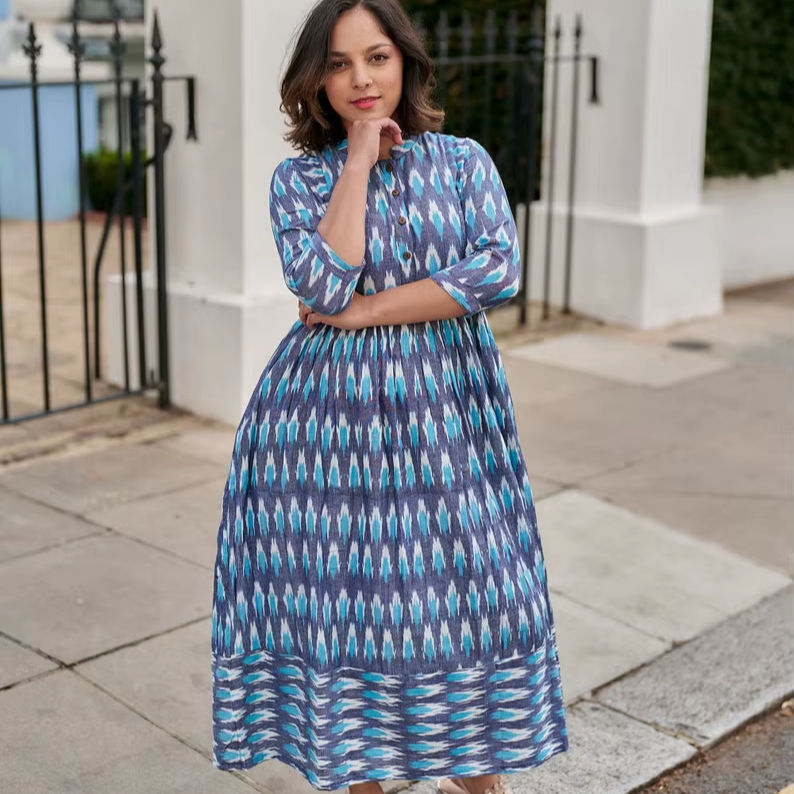 Robe Varuni Bohème en Coton Pur Tissé à la Main Ikat Bleue Casual Occasionnelle Mode Éthique