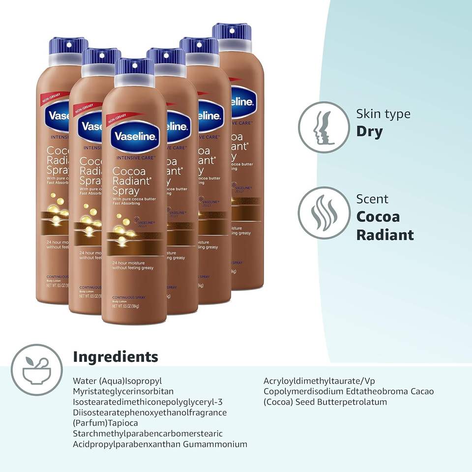 Vaseline Intensive Care Spray Moisturizer For Dry Skin Cocoa Radiant Made With 100% Pure Cocoa Butter 6.5oz (Pack of 6)