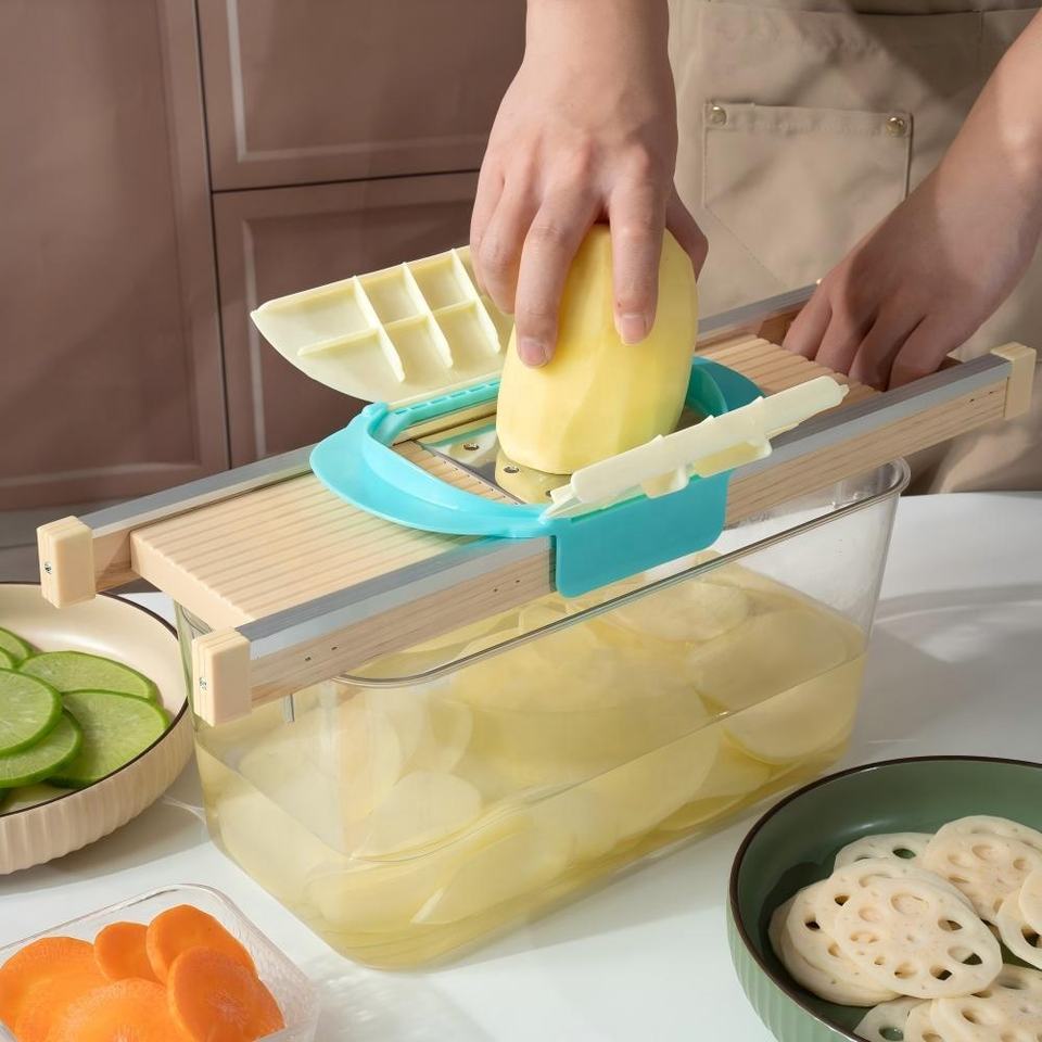 Hachoir à légumes et mandoline, trancheuse à oignon et pomme de terre, bâtonnet de 7 mm, invention brevetée, protège-main, gadget de cuisine en bois massif