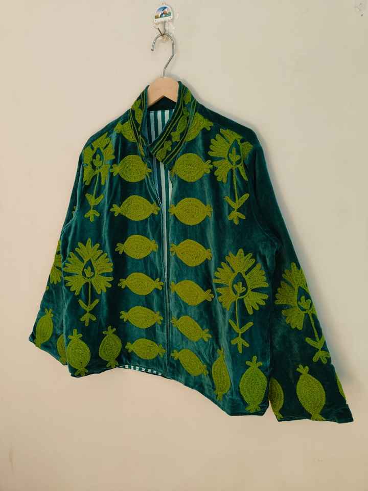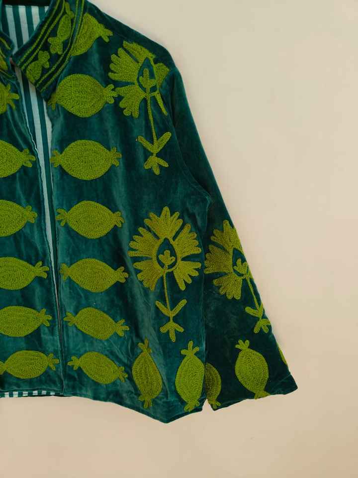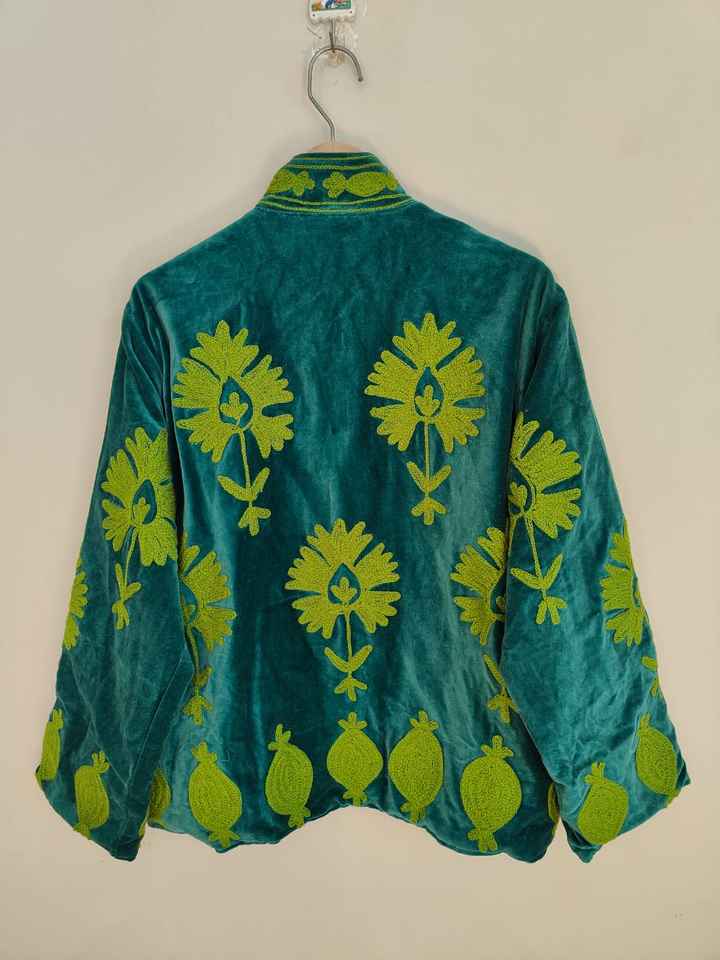 Veste en velours Suzani brodée à la main, manteau vert d'art populaire, veste ethnique bohème pour femmes