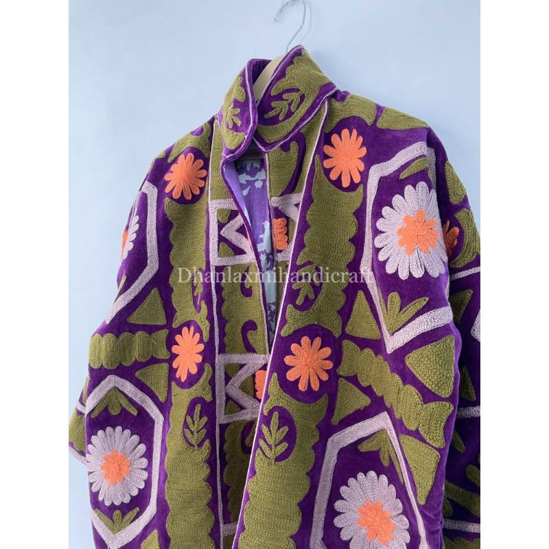Veste en velours Suzani à broderies florales, faite à la main, veste unisexe d'hiver avec tissu en coton à l'intérieur, style bohème hippie