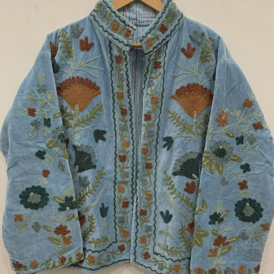 Veste brodée à la main en velours Suzani | Manteau bohème sur mesure à col | Veste hippie