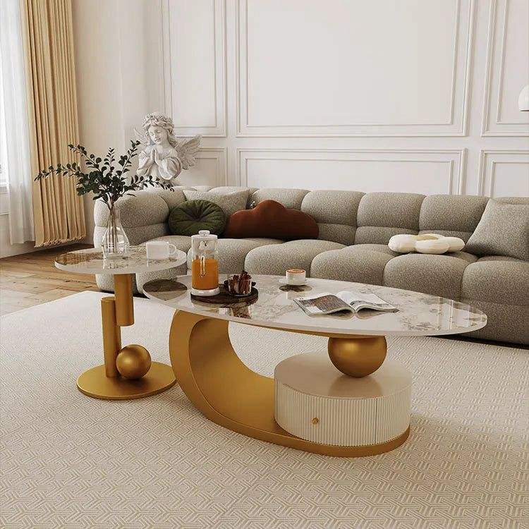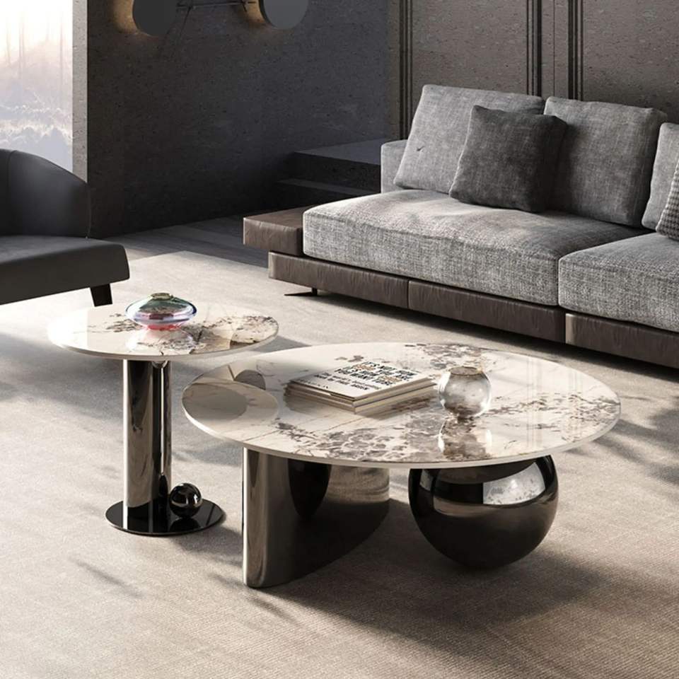 Table basse aspect travertin Venus, table centrale ronde moderne, mobilier de salon minimaliste beige, décoration scandinave