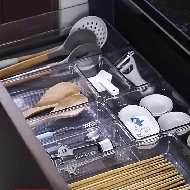 Organisateurs de tiroirs polyvalents en plastique transparent de 4 tailles pour le rangement des ustensiles de cuisine et des meubles de salle de bain Bacs de rangement sûrs pour les aliments