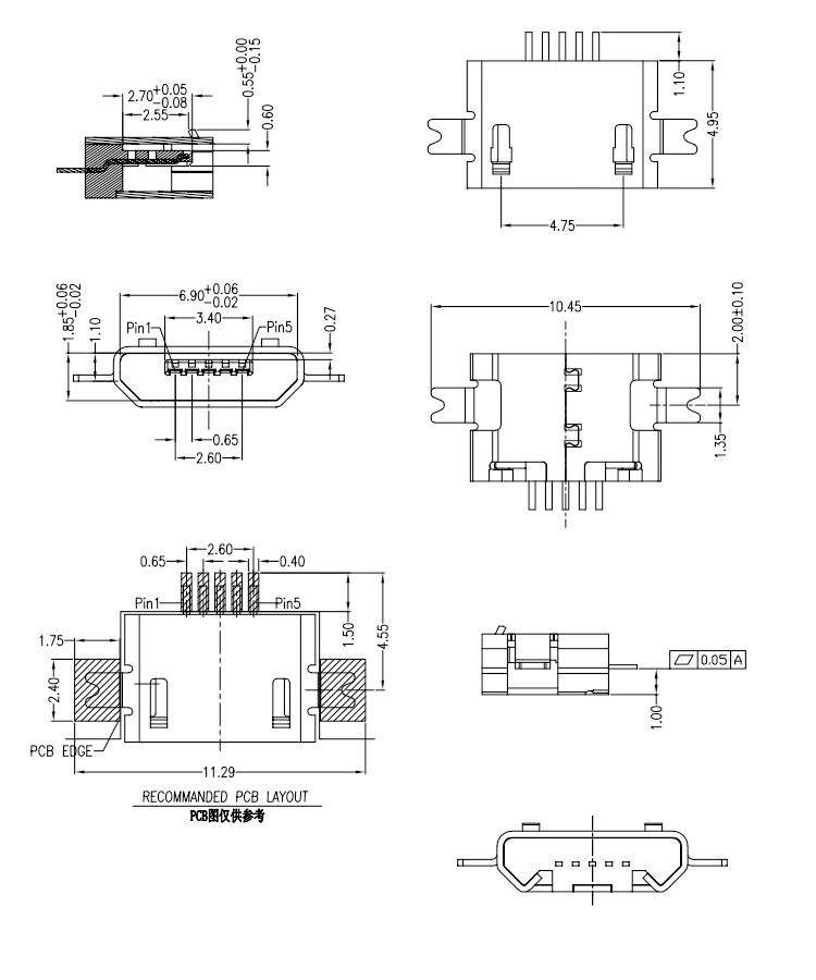 Port de charge micro USB vertical 5Pin Mid Mount 1.0mm Smt Micro USB Femelle B Type Connecteur