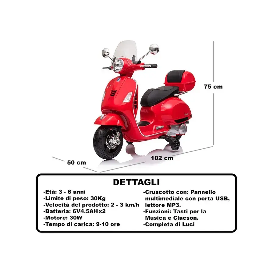 Scooter à 3 roues Vespa Rouge 6V 30W Moteur 2-3 Km/h Fabriqué en Italie Jouet électrique pour enfants 3-6 ans