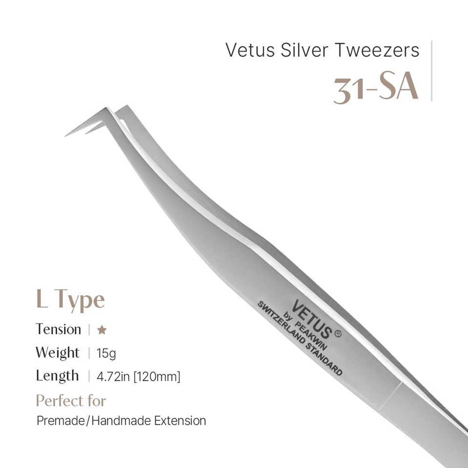 Pince à épiler courbée en L Vetus en acier inoxydable haute capacité, argentée, modèle 31-SA, pointes de précision en fibre pour cils 31-SA (forme en L)