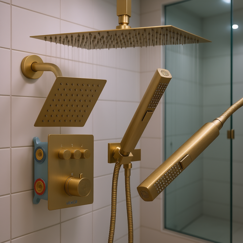 Système de douche à effet pluie Vevor 12 pouces en or brossé à montage au plafond avec kit de robinetterie murale et douchette à main