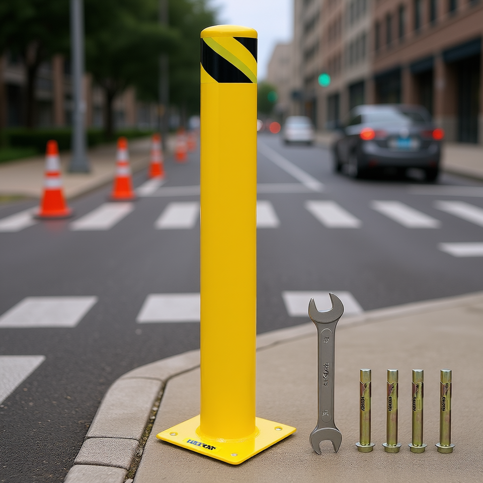 Poteau de signalisation de sécurité, hauteur 42 pouces, diamètre extérieur 4-1/2 pouces, acier thermolaqué jaune, pour zones de circulation