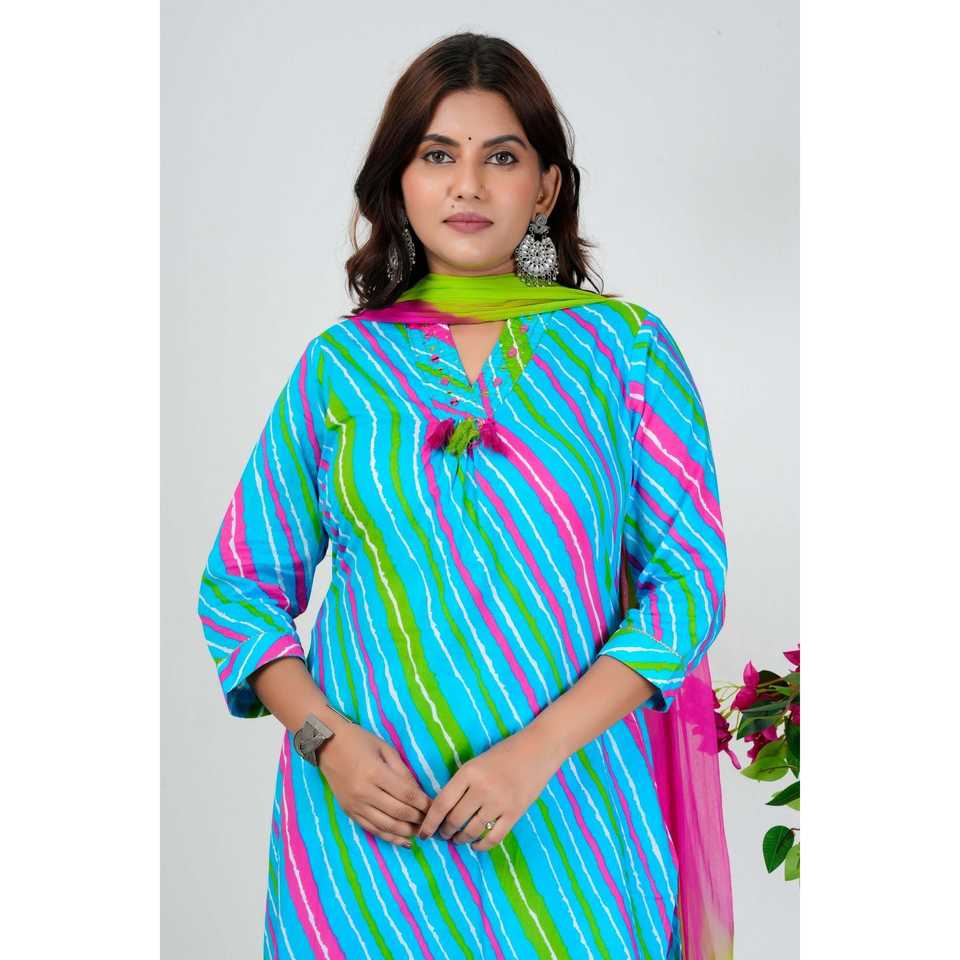 Color:Aqua blue striped kurta with pink-green ombre dupatta