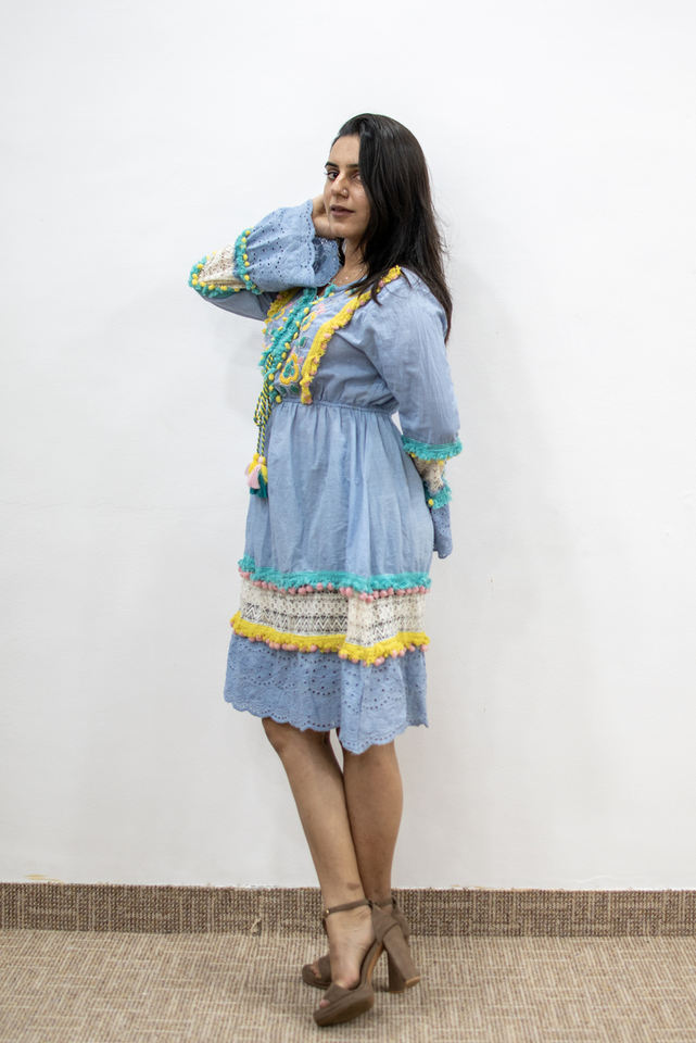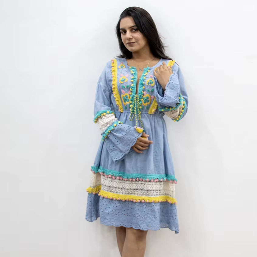 Robe bohème bleu vif avec dentelle à œillets et pompons, robe courte à col en V brodée, robe de vacances bohème