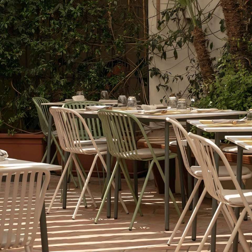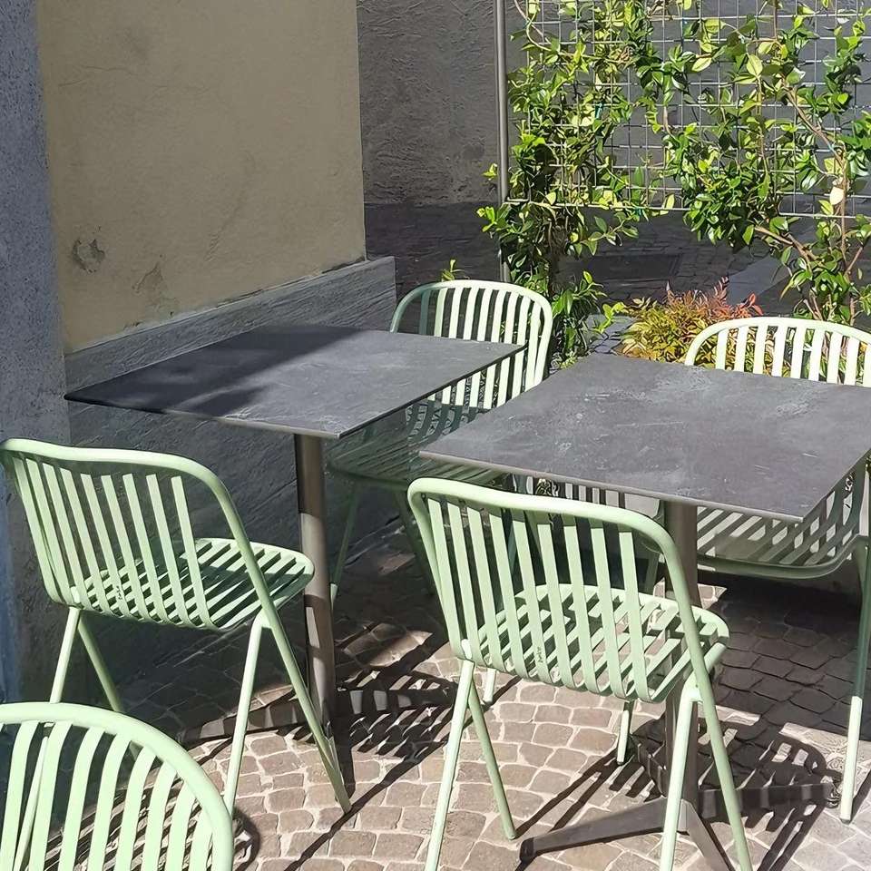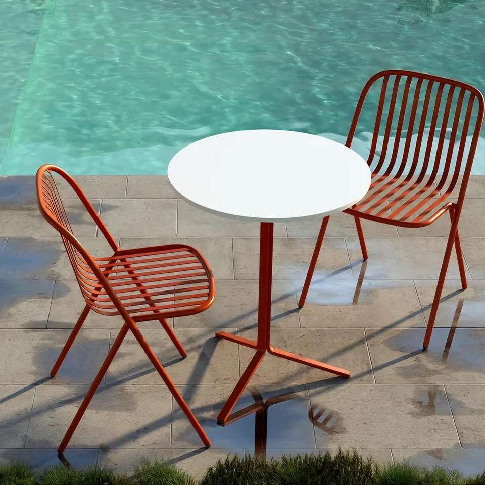 Ensemble de salle à manger extérieur moderne aux couleurs vibrantes, table et chaises en fer forgé, coussins imperméables pour usage commercial, salons de thé, cafés