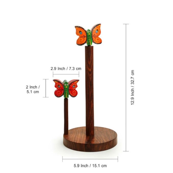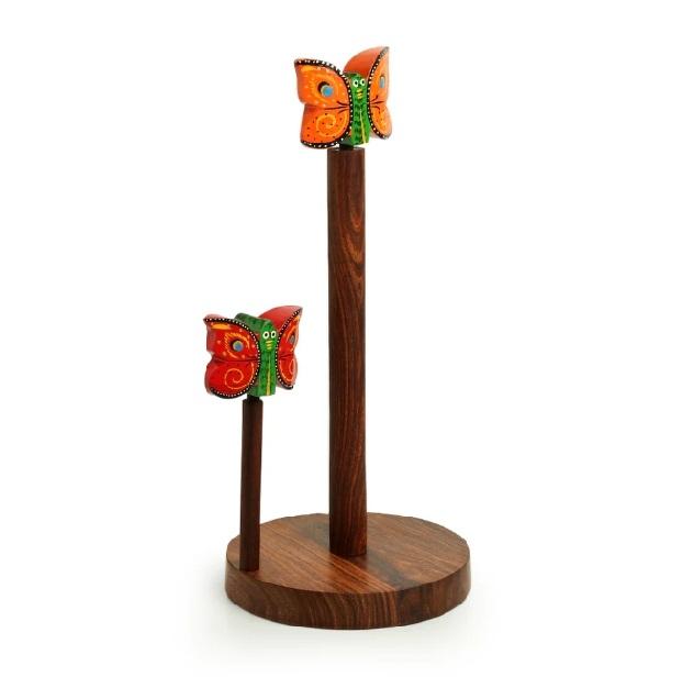 Vibrant Flutter 'Porte-rouleau de mouchoirs de cuisine artisanal en bois de Sesham Porte-serviettes Distributeur de rouleaux de comptoir Base antidérapante