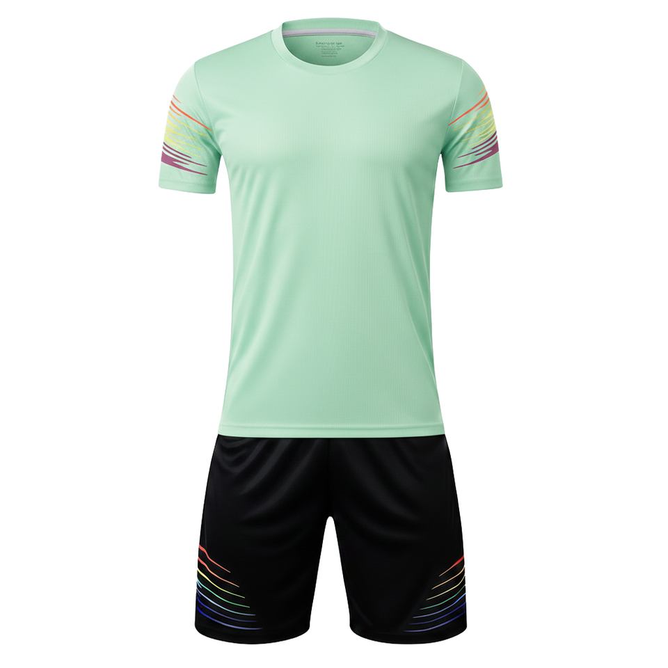 Ensemble de football vibrant en maille 100 % polyester, coupe automatisée, dégradé de couleurs, maillot de football à manches courtes et short à cordon de serrage