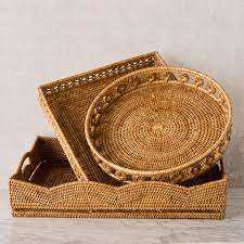 Vietchoice High Quality Modern Design Retro Woven Natural Storage Bread Snack Fruit Rattan Tray Set 3 28cm Portable Kitchen Use