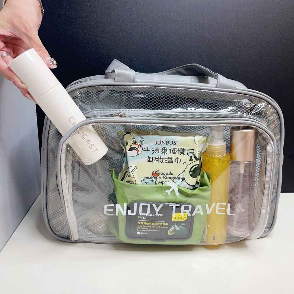 Description:Un sac cosmétique clair élégant fait à partir du matériel imperméable de PE