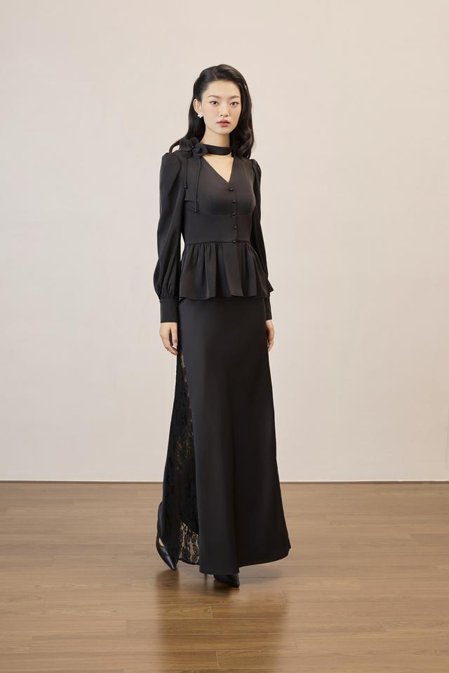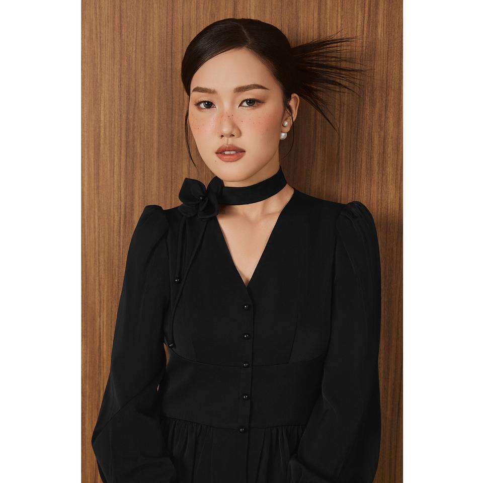 Fashion Element:3D Flower, Choker Neck, Pleated Hem