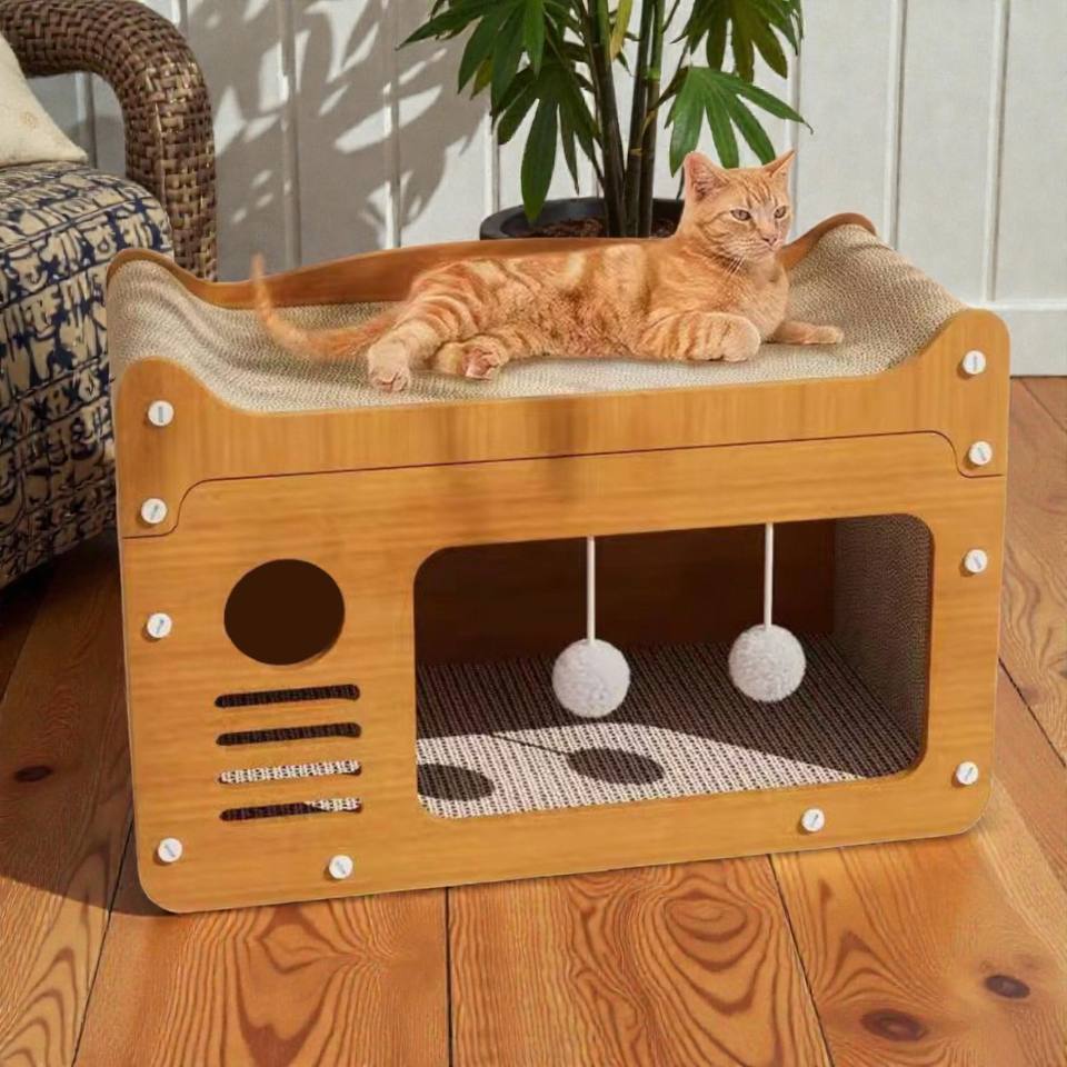 Vietnam Factory Wooden Cat Scratcher Box House Double Deck Pet Bed Lounge with High Density Corrugated Pad