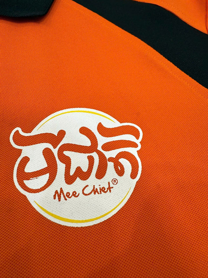 Design:Orange polo with black accents and 2-button placket