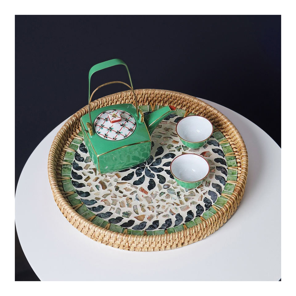 Plateau de service de luxe artisanal et écologique en nacre vietnamienne avec motifs géométriques décoratifs pour cuisine et café