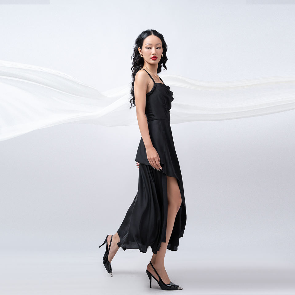 Soft draped neckline with flowy asymmetricFeature