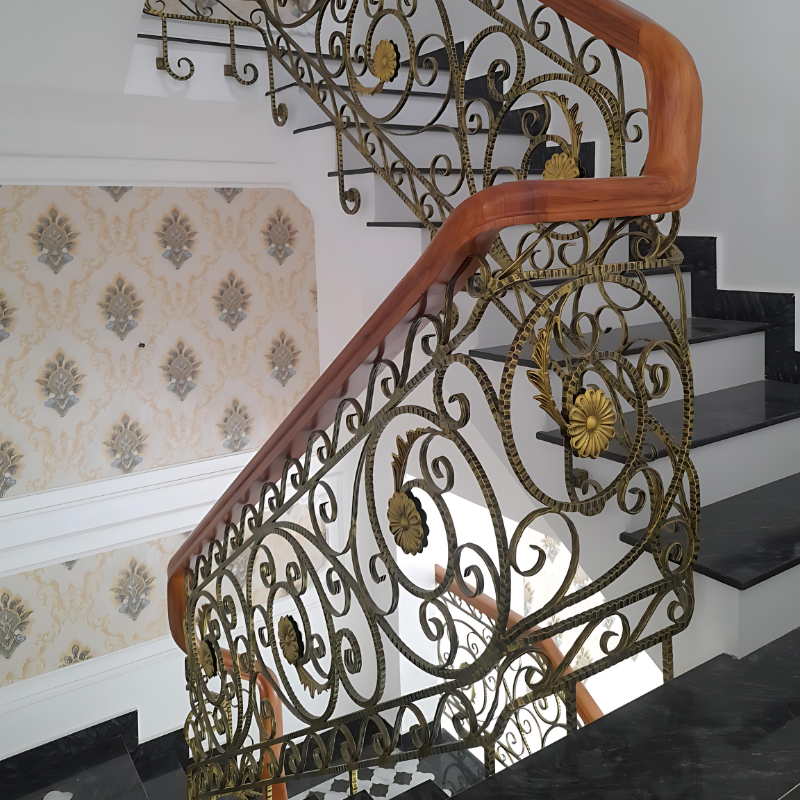 Vietnam-made indoor iron stair railing powder coated black finish with ornamental hand forged stair parts for elegance