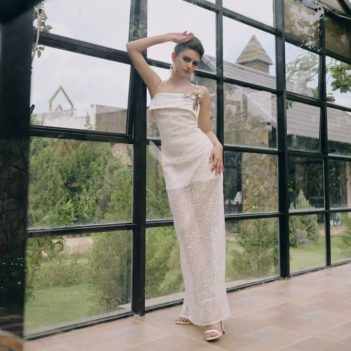 Vietnamese brand Star Lace Dress Elegant Sexy Romantic Maxi Straight 3D Flower High Quality Local Brand Good Price Small MOQ