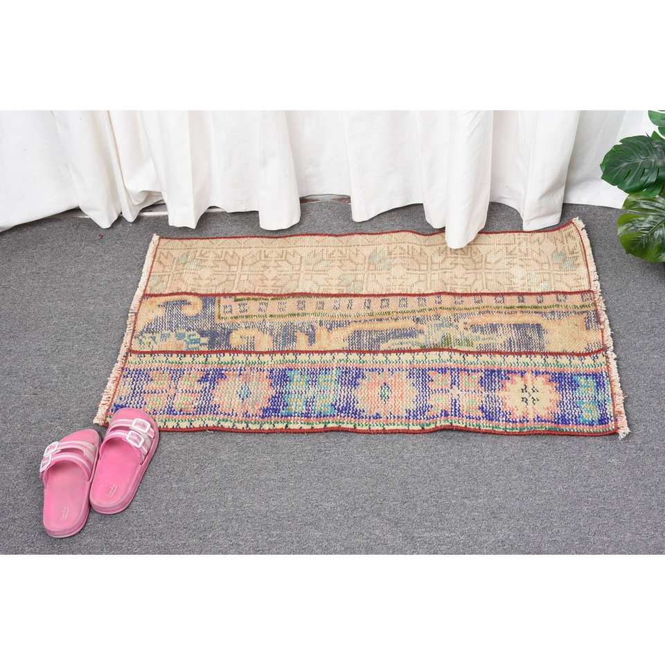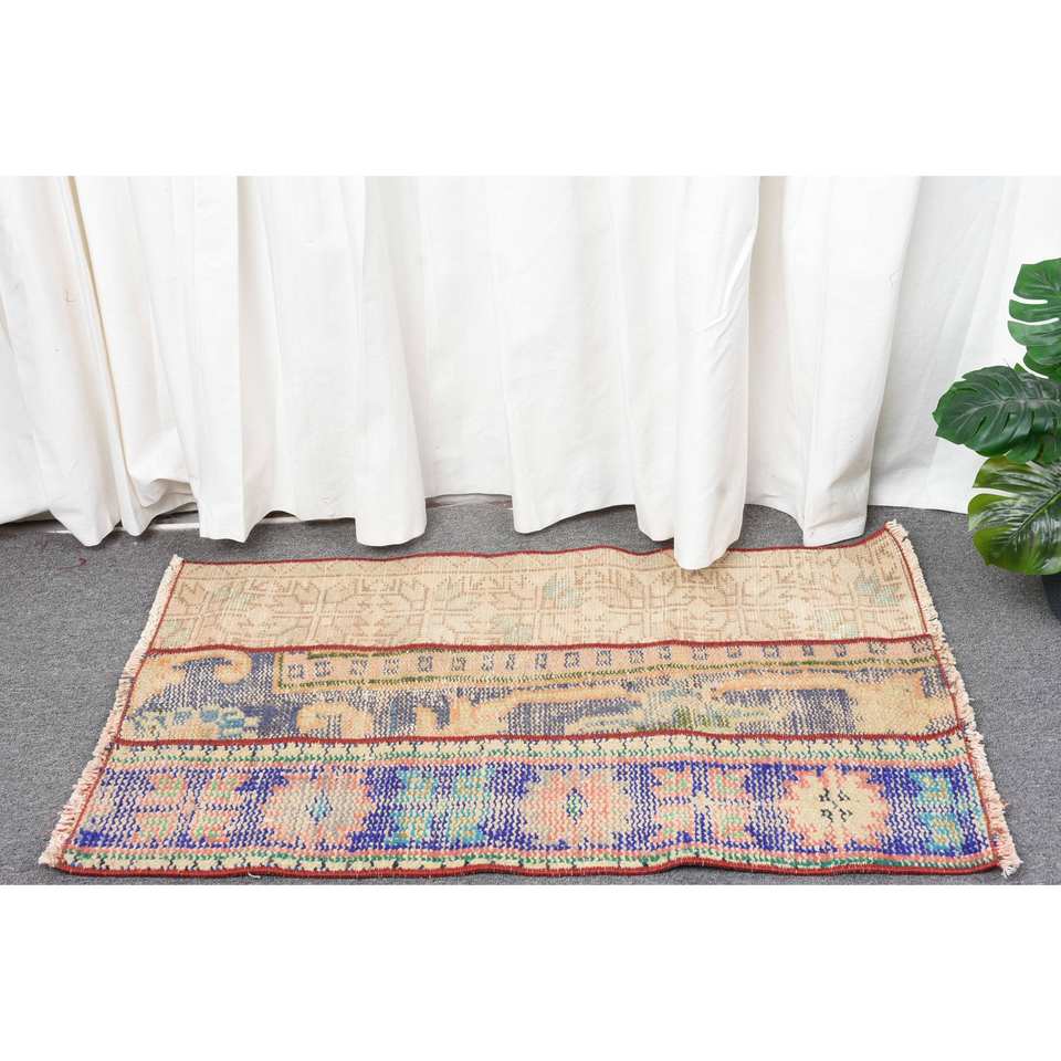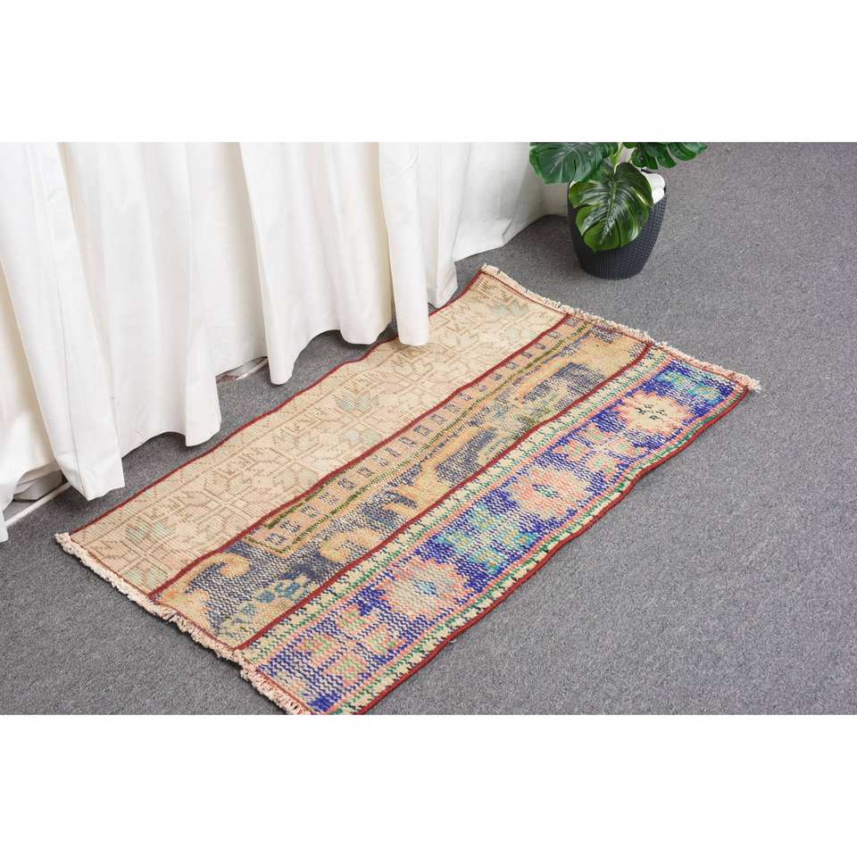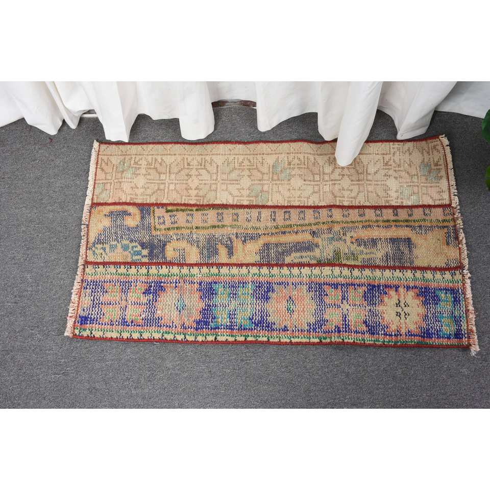 Vintage 1.7 X 2.9ft Turkish Wool Rug Beige & Blue Patchwork Flat Weave for Living Room Decorations Latex Backed