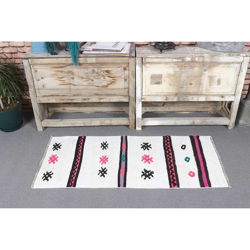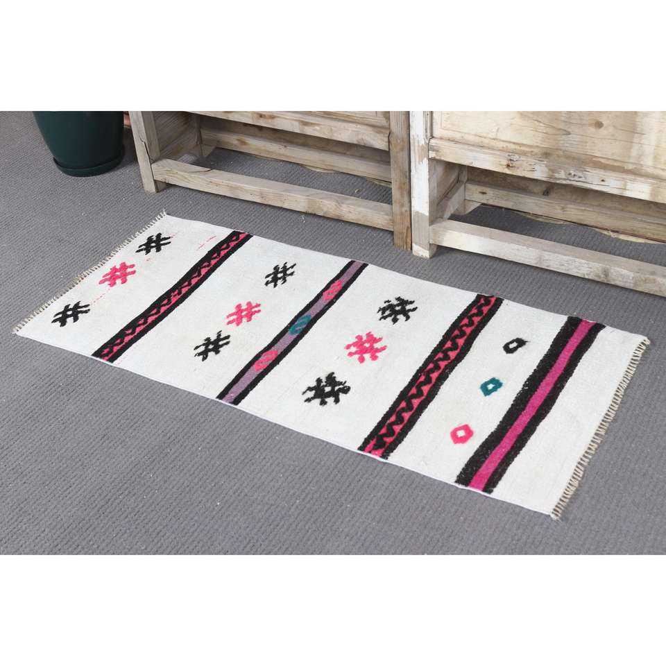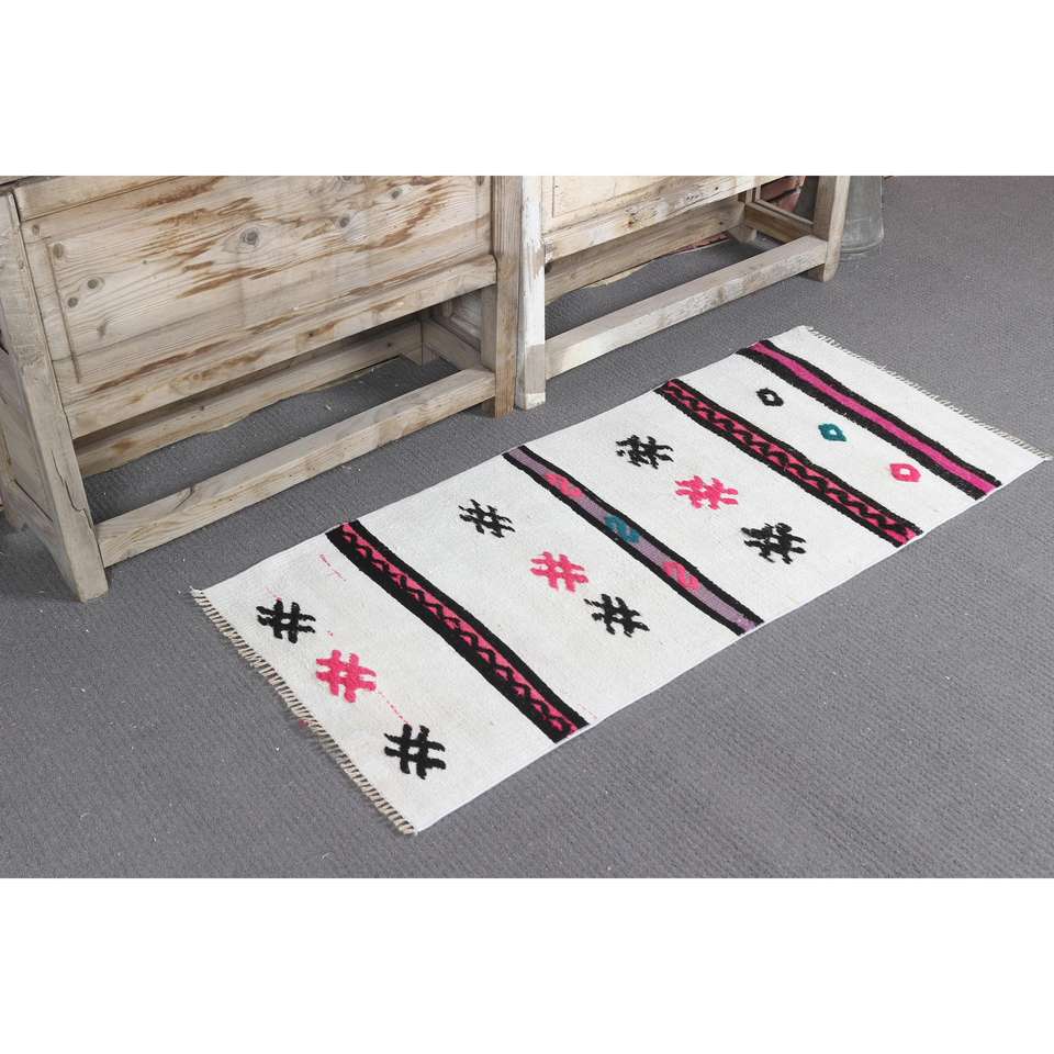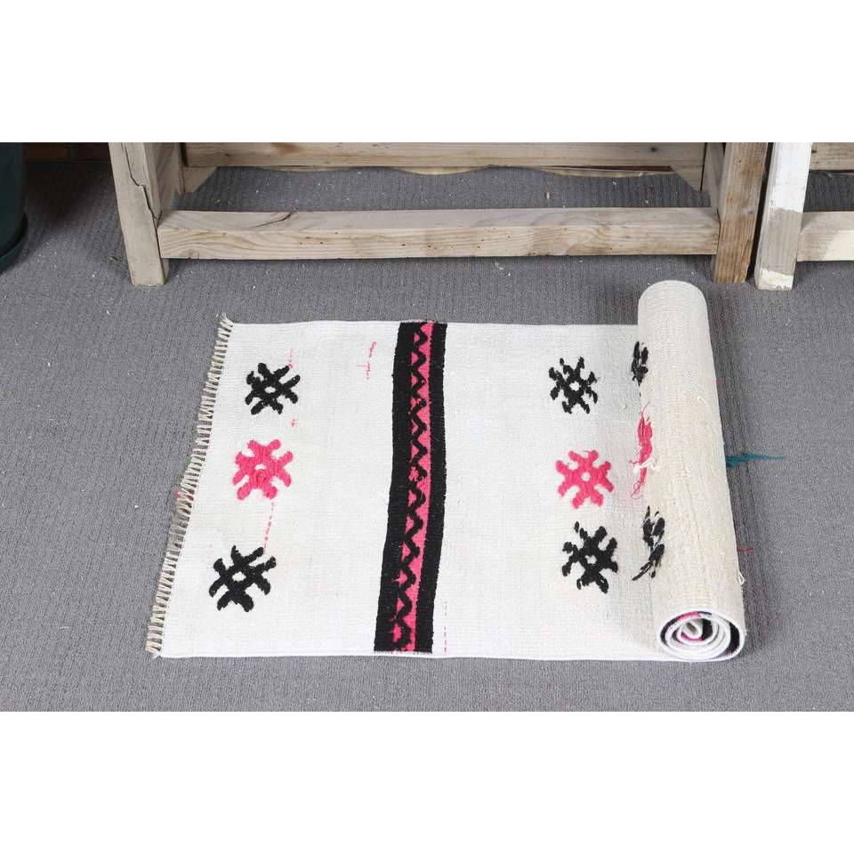 Tapis vintage 1,8x4 pieds, petit tapis turc, tapis oriental blanc rose