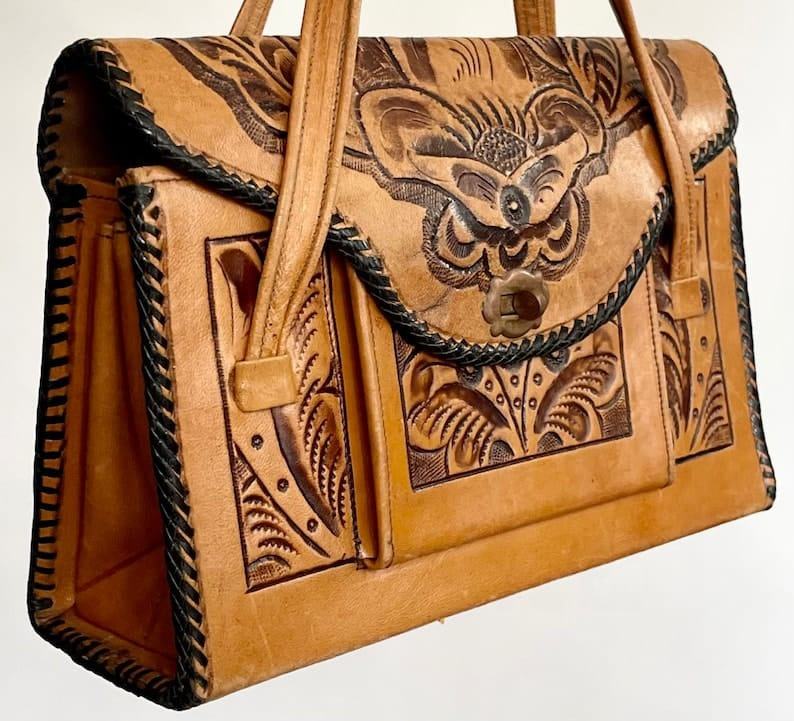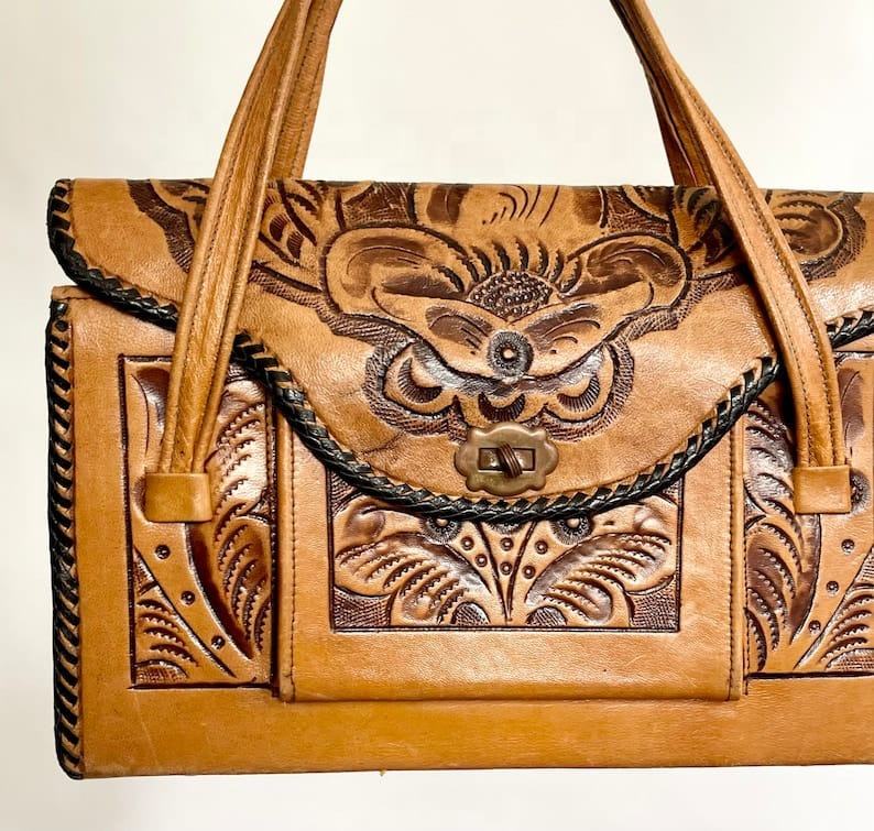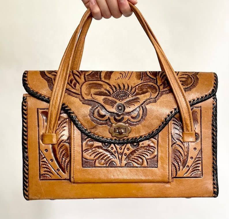 Vintage 1770s Western Cow Leather Women's Luxury Hand Bag With Hand Tooled Floral & Solitaire Design Ready to Stock Bags
