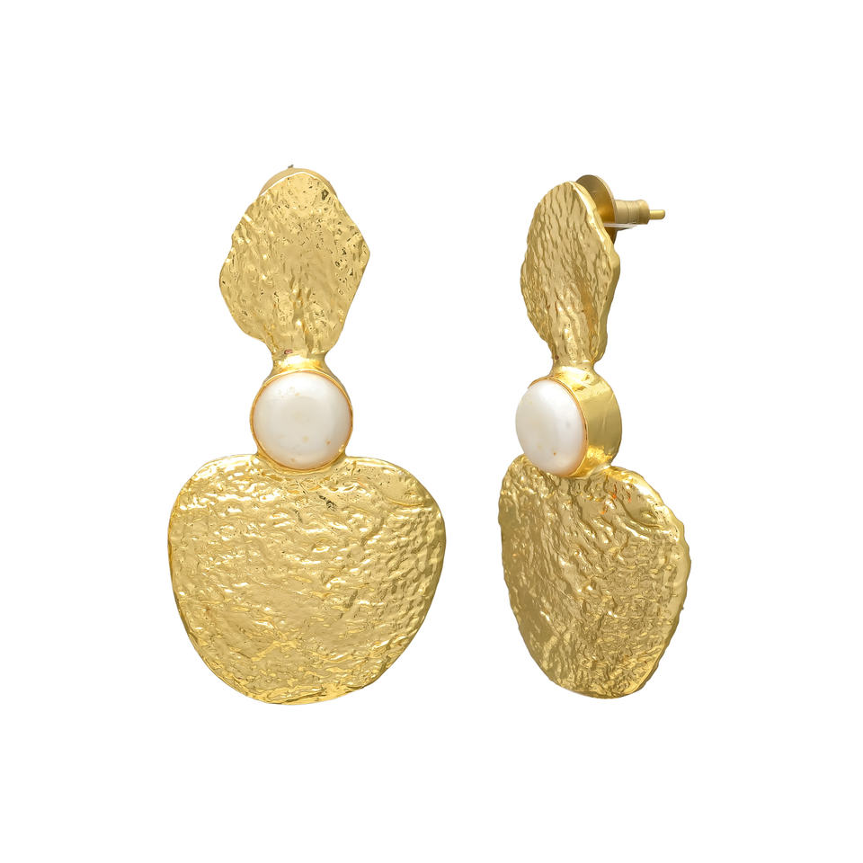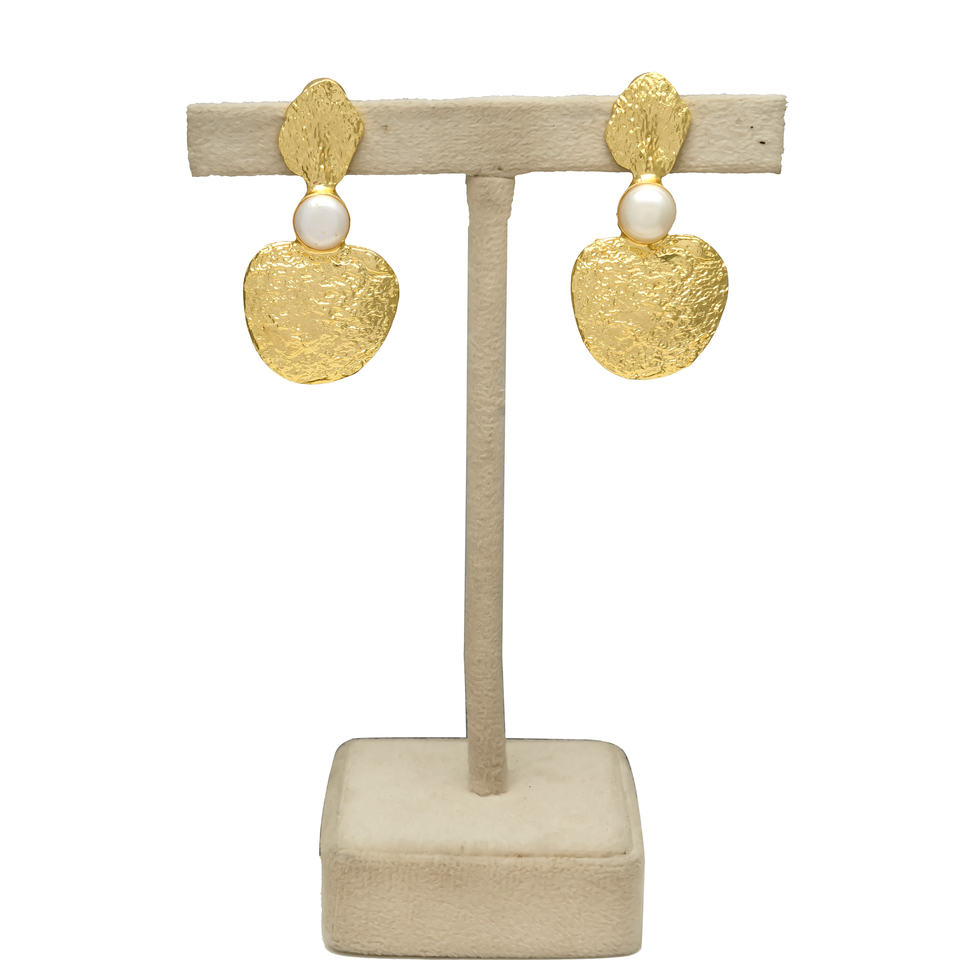 Vintage 24K Gold Plated Freshwater Pearl Stud Earrings Women's Brass Statement Leaf Shape Texture Melting Effect Weddings