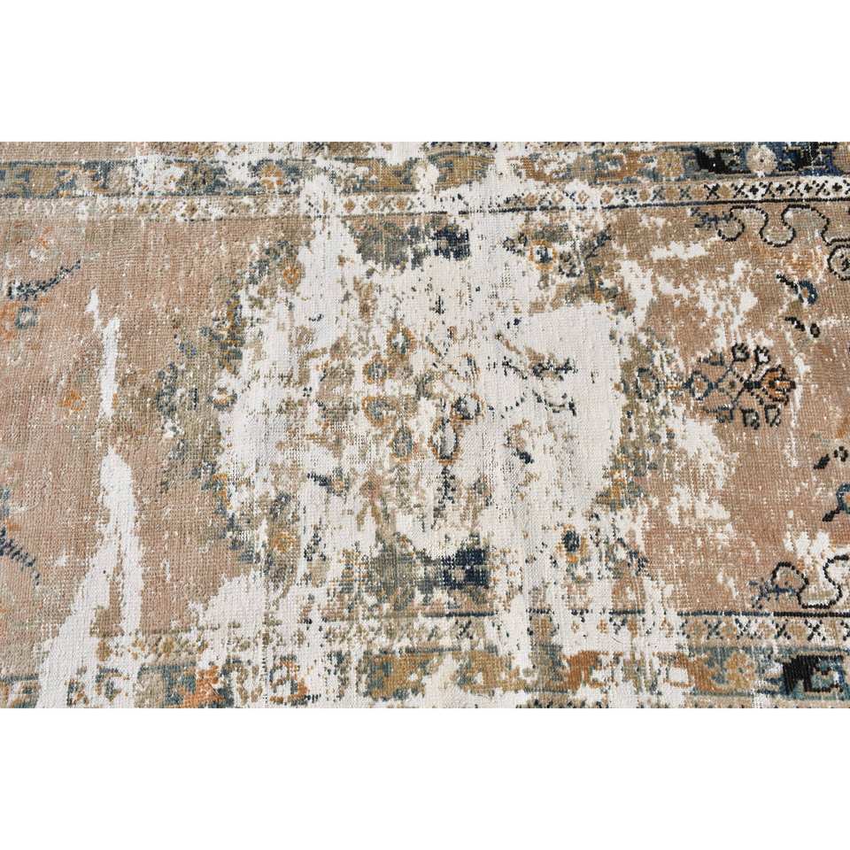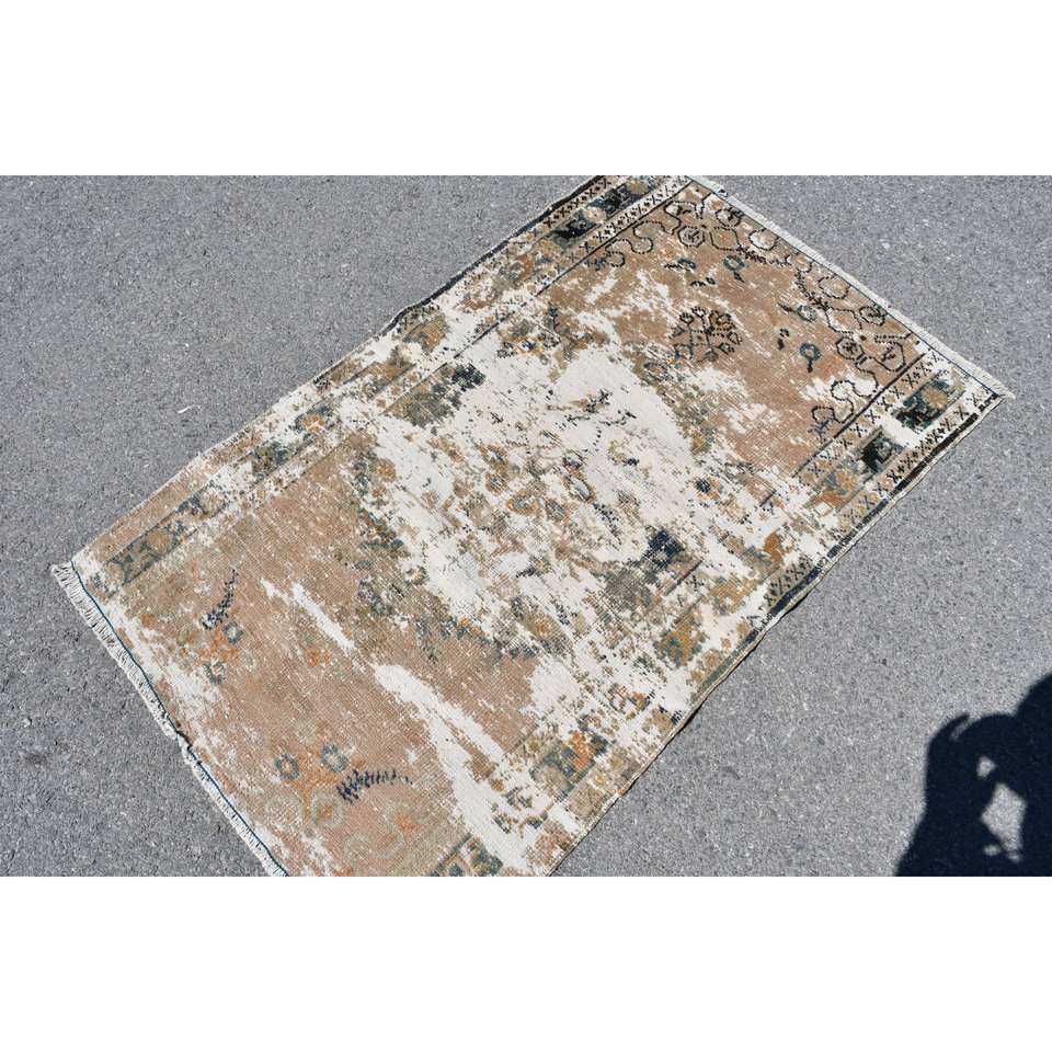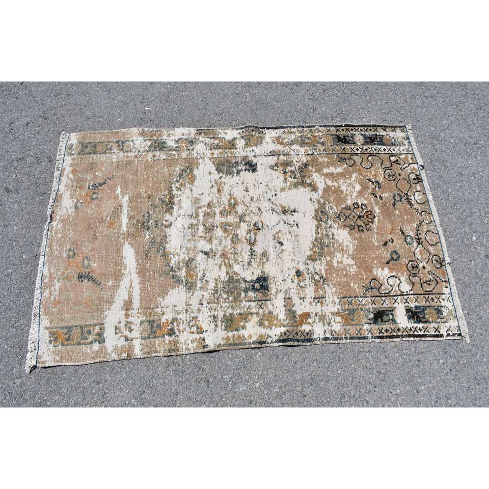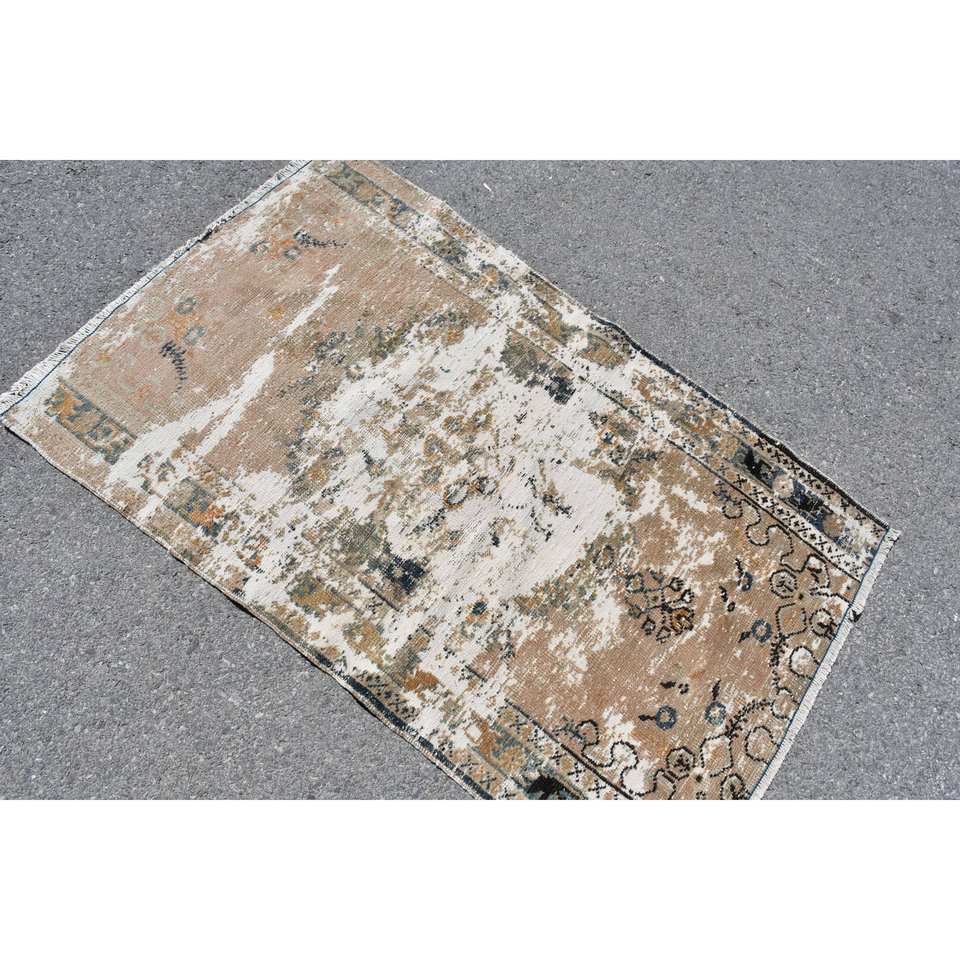 Tapis turc vintage 3x4,7 pieds, brun beige, fait main en laine, écologique, poils moyens, motif patchwork classique, support en latex pour