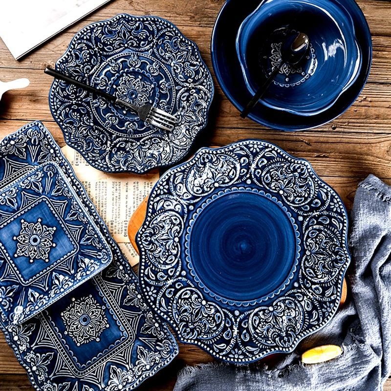 Service de vaisselle en céramique de style baroque vintage, plateau de service à steak en porcelaine, plateau à salade et à dessert, bol à soupe, vaisselle de restaurant