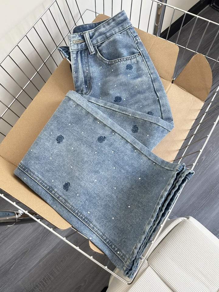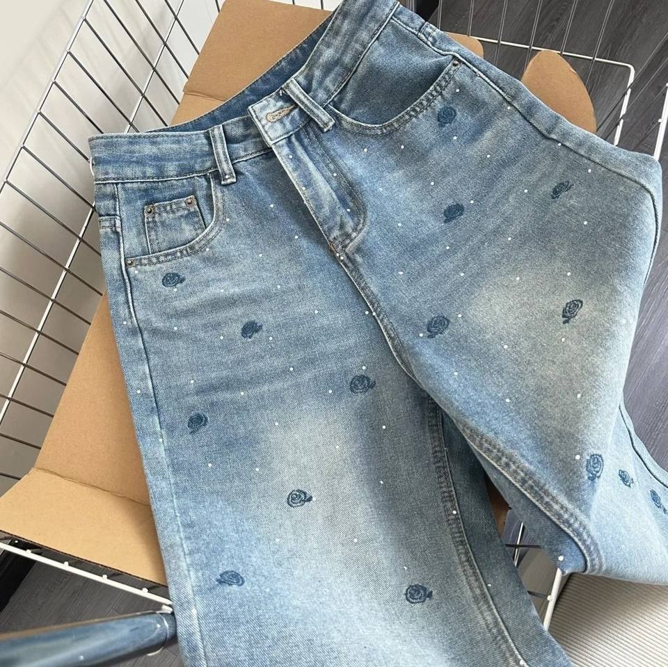 Jean en denim vintage bleu rose brodé de strass pour femme, taille haute, coupe droite, délavé, tendance été